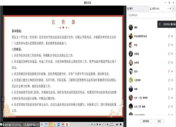体育与大健康学院成立于2022年,并在院党总支和校团委领导下成立了体育与大健康团总支·学生会,在团总支下设五个部门,分别为办公室、组织部、艺体部、宣传部、纪检部。学生会下设四个部门,分别为学生服务中心、学术科技中心、新闻信息中心、校园文化中心。王老师分别讲解了每个部门的工作职责以及竞聘条件和具体的流程。