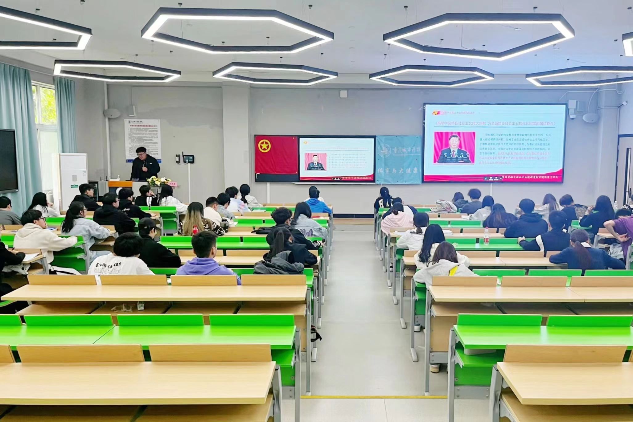 王老师从“党的二十大主题及主要成果”“关于过去五年的工作和新时代十年的伟大变革”“马克思主义中国化时代化”“关于中国式现代化”和“应对风险挑战”五个方面进行宣讲。