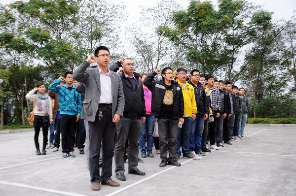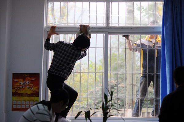 首先,学生党员同志们按照第一支部、第二支部站成两个方阵,面对党旗进行了宣誓仪式,重温了当年的入党誓词。宣誓结束之后,同志们带着自己事先准备好的劳动工具分工打扫“土木山庄”办公室。同志们按照之前的分工,一人一间或几人一间的分配好了任务,将门窗和办公桌都擦得一尘不染,最后再清扫地面。大家都干的热火朝天,积极的投入到此次党组织生活中。
