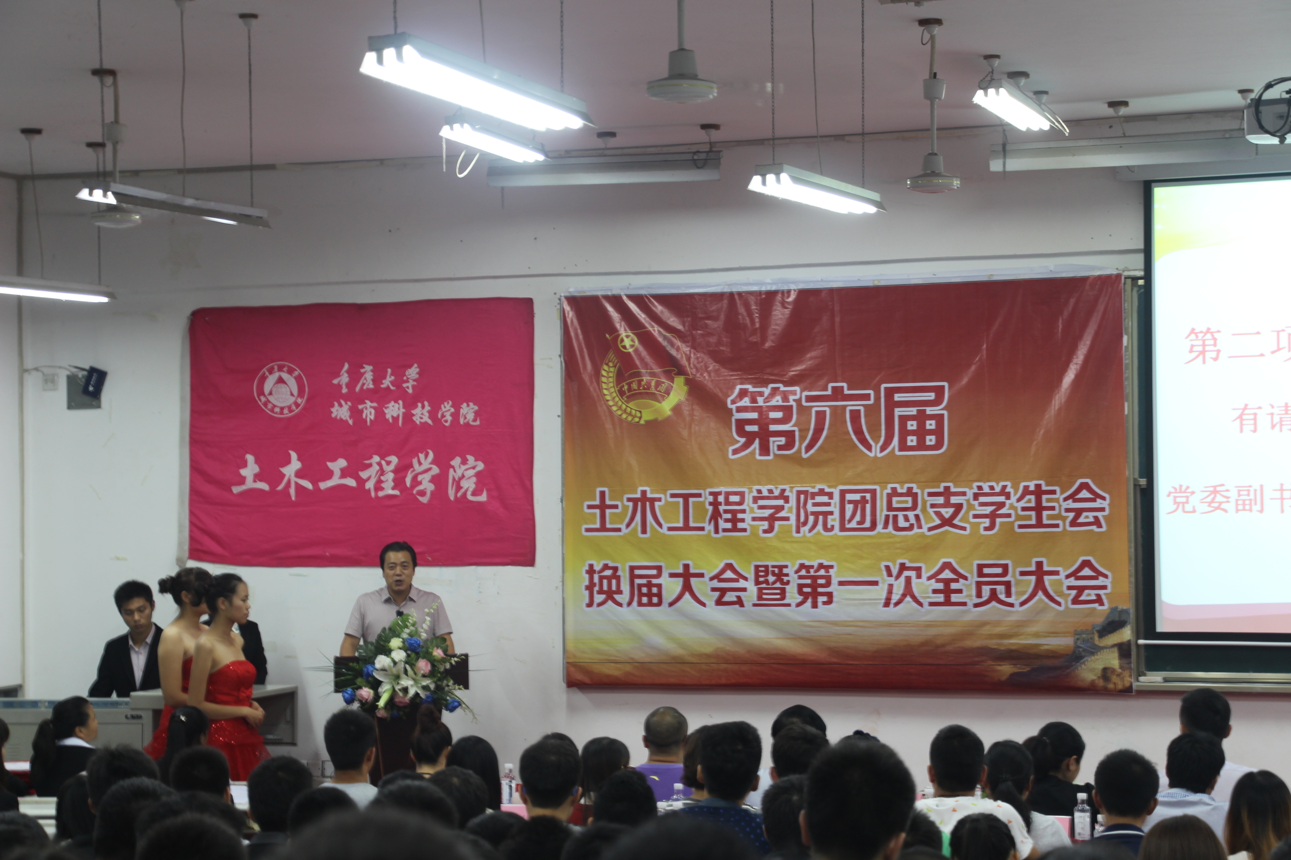 10月10日19:30,土木工程学院在主教105成功举行了第六届团总支学生会换届大会暨第一次全员大会。重庆大学城市科技学院党委副书记副校长章锋云、土木工程学院院长李平诗、党总支书记何湘丽、第一党支部书记岳玉康、第二党支部书记林立和团总支书记龚艺莅临此次大会。土木学院的各位辅导员、各二级学院代表和团总支学生会的新老干部、干事也参加了本次大会。