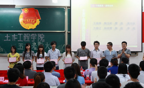 五星红旗凝鲜血,四化蓝图赖俊杰。在中国共青团成立90周年之际,5月9日土木工程学院召开了2011——2012学年五四表彰大会。