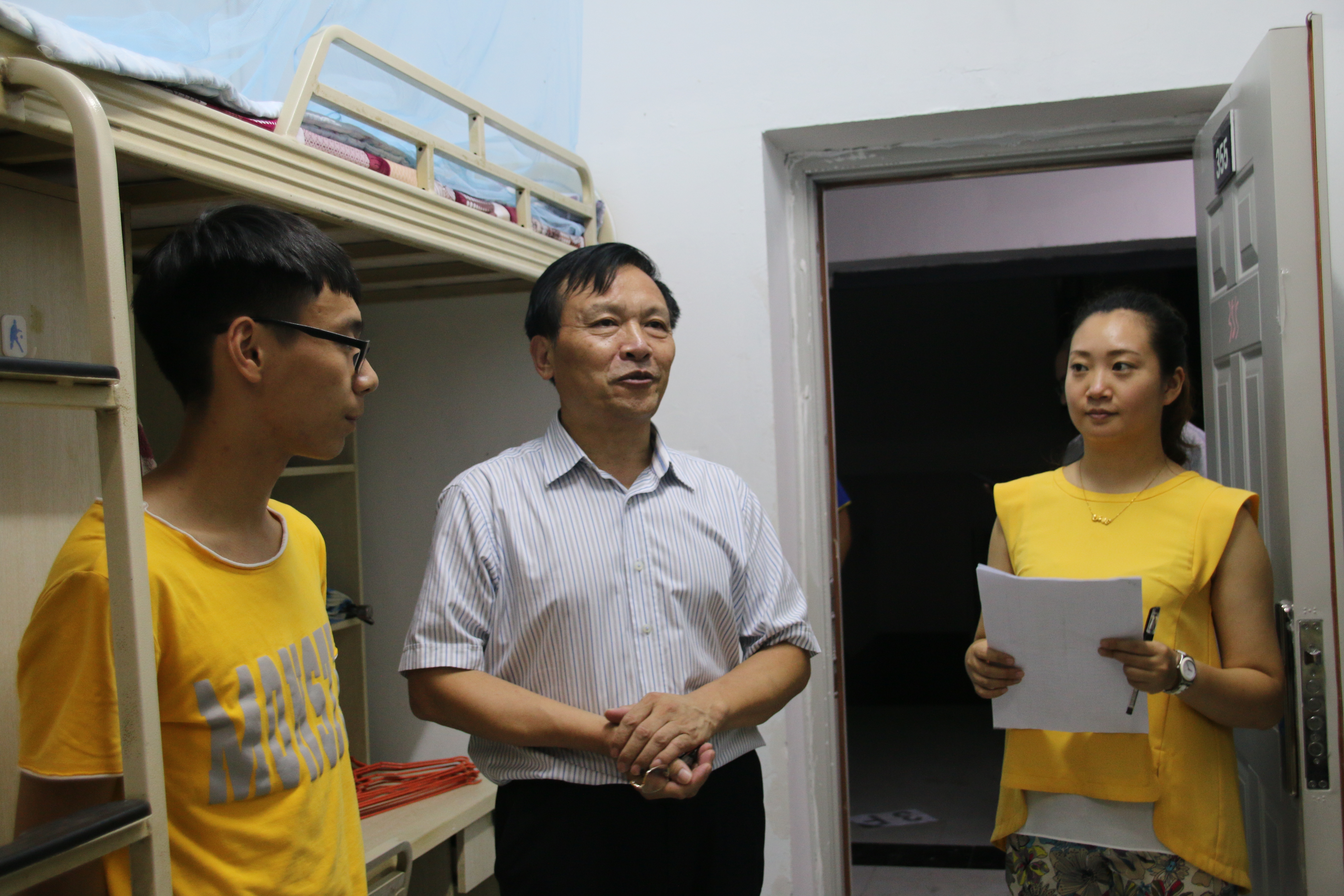 在结束了繁忙的迎新工作后,于9月6日晚上8点30分土木工程学院院长李平诗、党总支书记何湘丽、团总支书记龚艺、第一党支书记岳玉康和辅导员洪孝兵一同对新生公寓进行第一次查寝。