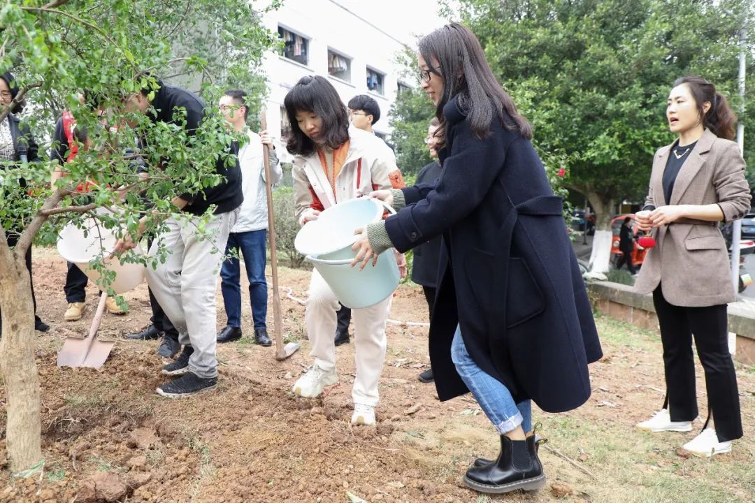 植树现场,大家热情高涨,扶苗、培土、浇水,分工协作,共同栽下象征着绿色和希望的“团结树”。