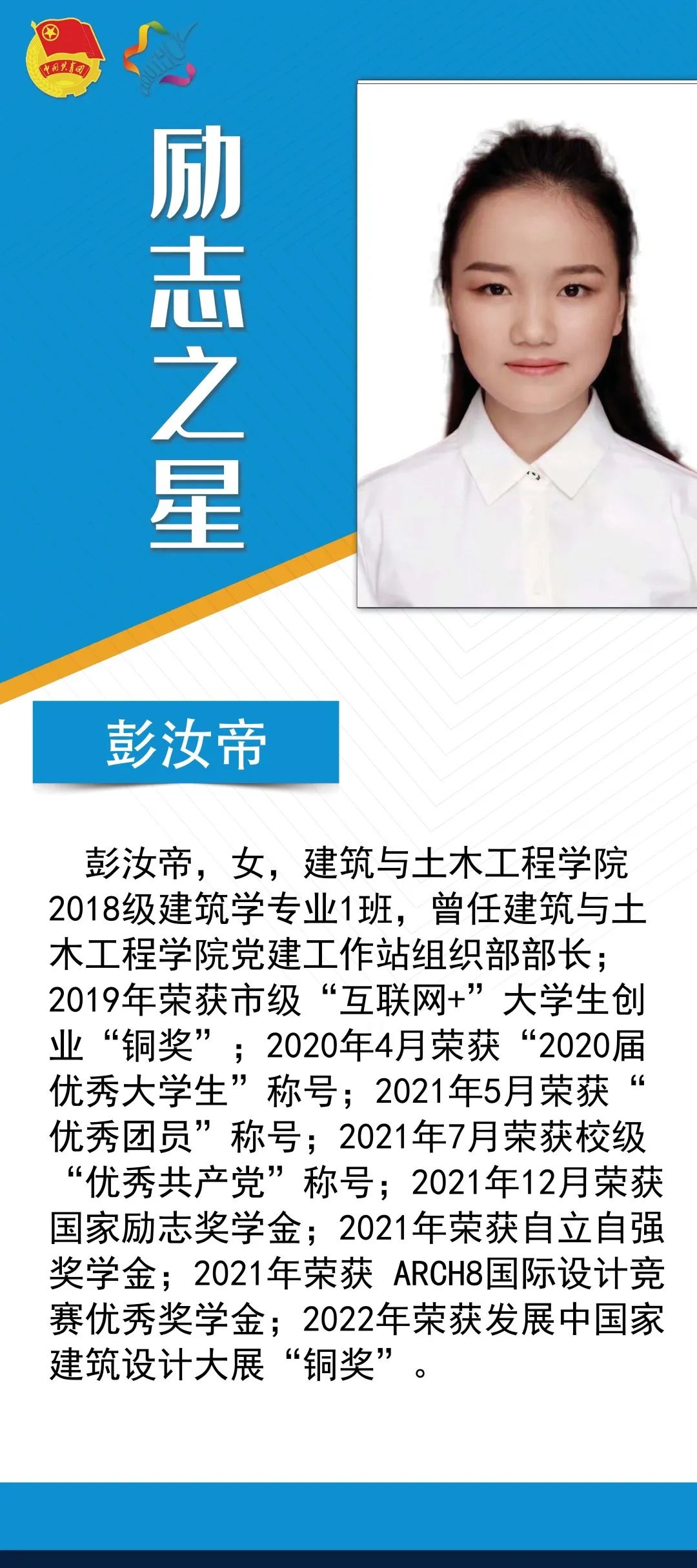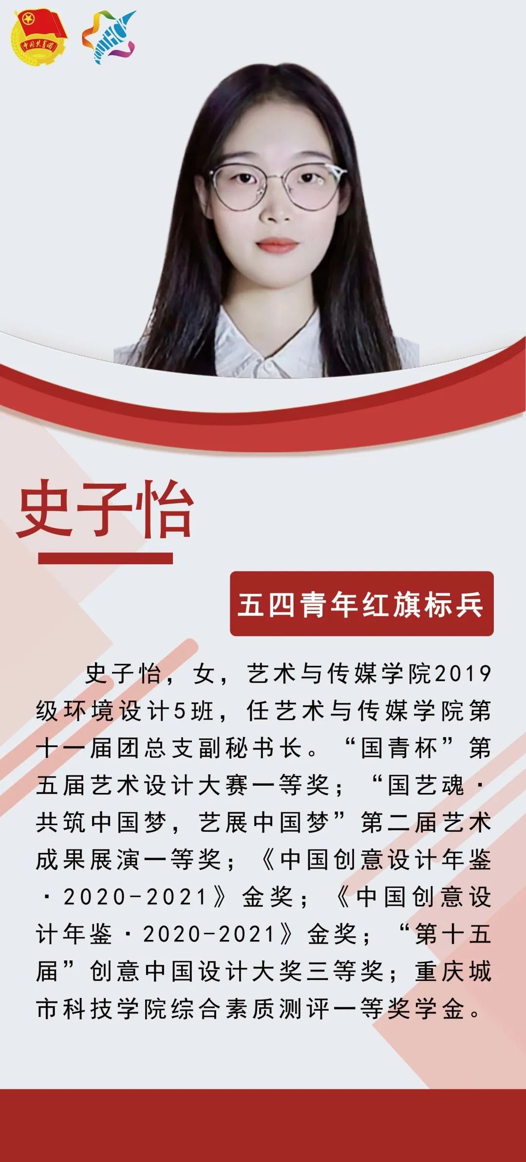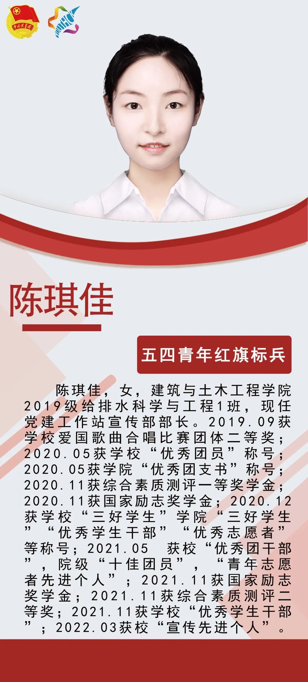 时代各有不同,青春一脉相承,奋斗是青春最亮丽的底色,行动是青年最有效的磨砺,青年如初春,如朝日,如百卉之萌动,共青团始终同根同脉连着党、耿耿红心向着党、坚定不移跟着党奋斗。在过去的2021-2022学年中,我校广大团员青年坚决拥护党的基本路线、方针、政策,学习党的科学理论特别是习近平新时代中国特色社会主义思想,自觉增强“四个意识”、坚定“四个自信”、做到“两个维护”,家国情怀和时代责任感强,自觉维护国家安全,带头传承中华优秀传统文化,民族自尊心、自信心、自豪感强,自觉践行社会主义核心价值观,涌现出一大批引领风尚,自信自强,以身作则的优秀青年学生代表,他们用实际行动在美好的青春年华里展示着青年的朝气与锐气,下面让我们来看看2022年五四青年榜样风采!