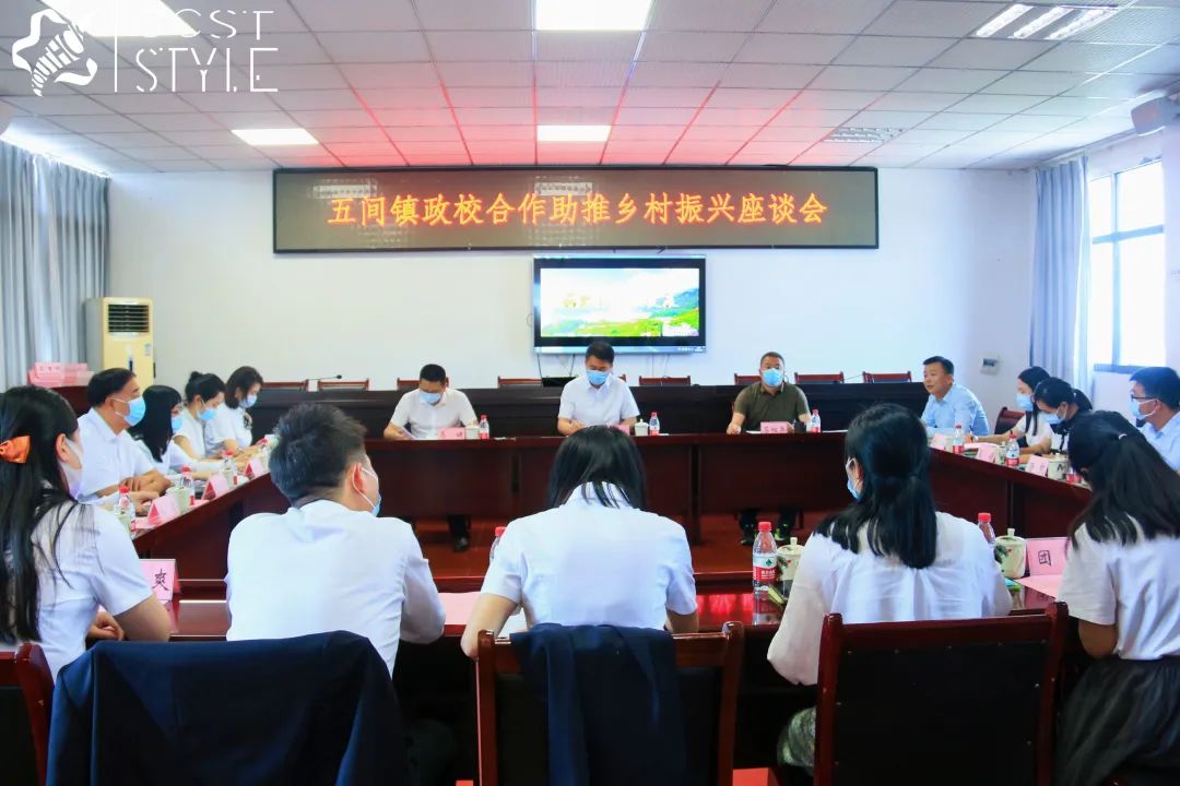 在五间镇人民政府双方就政校合作助推乡村振兴事宜进行座谈交流。学校副校长郭建礼,学生处处长马健,团委书记、学生处副处长万毅,校办公室副主任李宇,教务处副处长杨明静,经济管理学院院长张子林、经济管理学院党总支书记、副院长冯鑫、艺术与传媒学院党总支书记、副院长陈宣君、建筑与土木学院副院长段旻、建筑与土木学院党总支副书记王爽与五间镇党委书记苏祖兵,党委副书记、镇长贾林涛,党委副书记赵品等相关负责人参加了会议。
