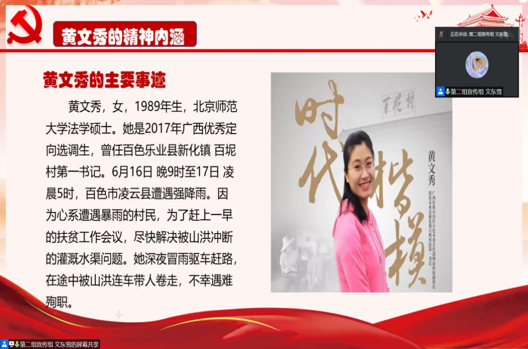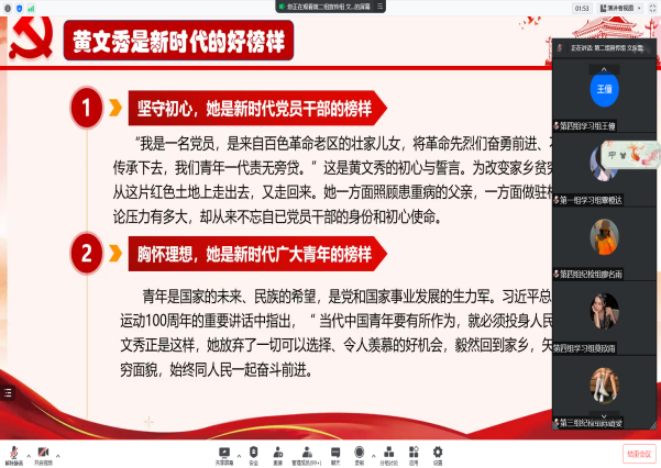青衿之志,履践致远。为进一步学习榜样精神,汲取奋进力量,强化先进典范的教育引领作用,争做堪当民族复兴的时代新人。经济管理学院第一期“青春向党,星火之光”入党申请人培训营于8月14日中午12:00在腾讯会议开展第四次理论学习。本次理论学习由培训营第二组成员文东雪主讲,全体营员参与。