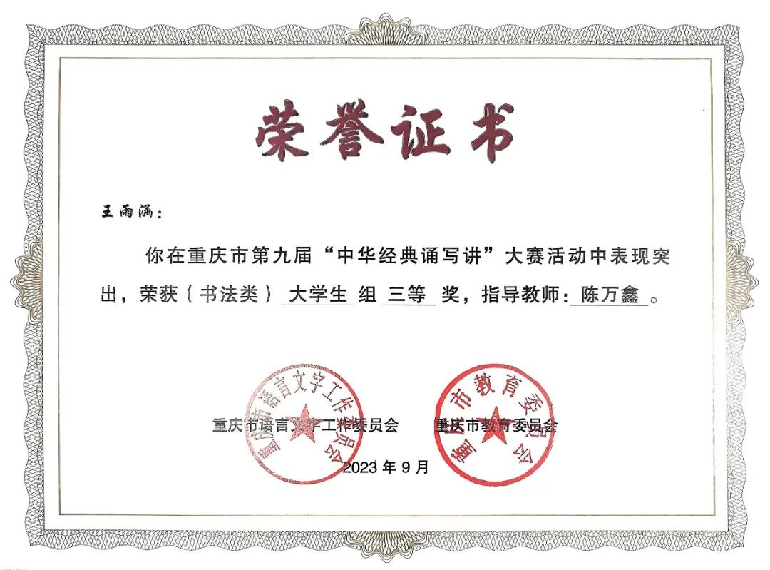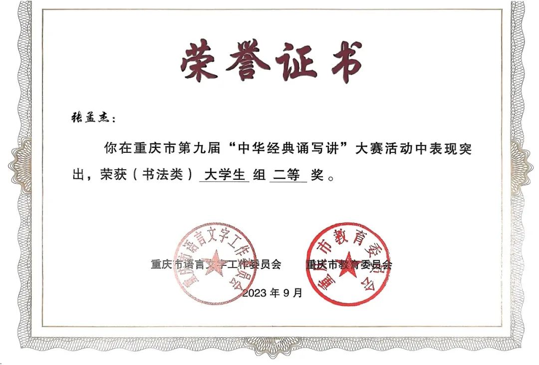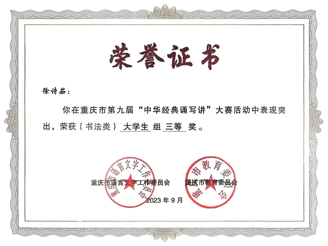 我校积极组织师生参加,认真备赛,选送作品精益求精,以热忱之心感受字里千秋,以坚定初心传承传统文化,荣获多项荣誉。其中,张孟杰同学荣获(书法类)大学生组二等奖;徐诗茹、王雨涵荣获(书法类)大学生组三等奖;尹苏智、高锐、倪凡、李亚楠、张柏菘、王浩硕等同学荣获(诵读类)大学生组三等奖;姚思远、王铸、肖雨、刘易、宋林山、唐漫琴、陈宇姗等教师荣获(诵读类) 教师组三等奖。