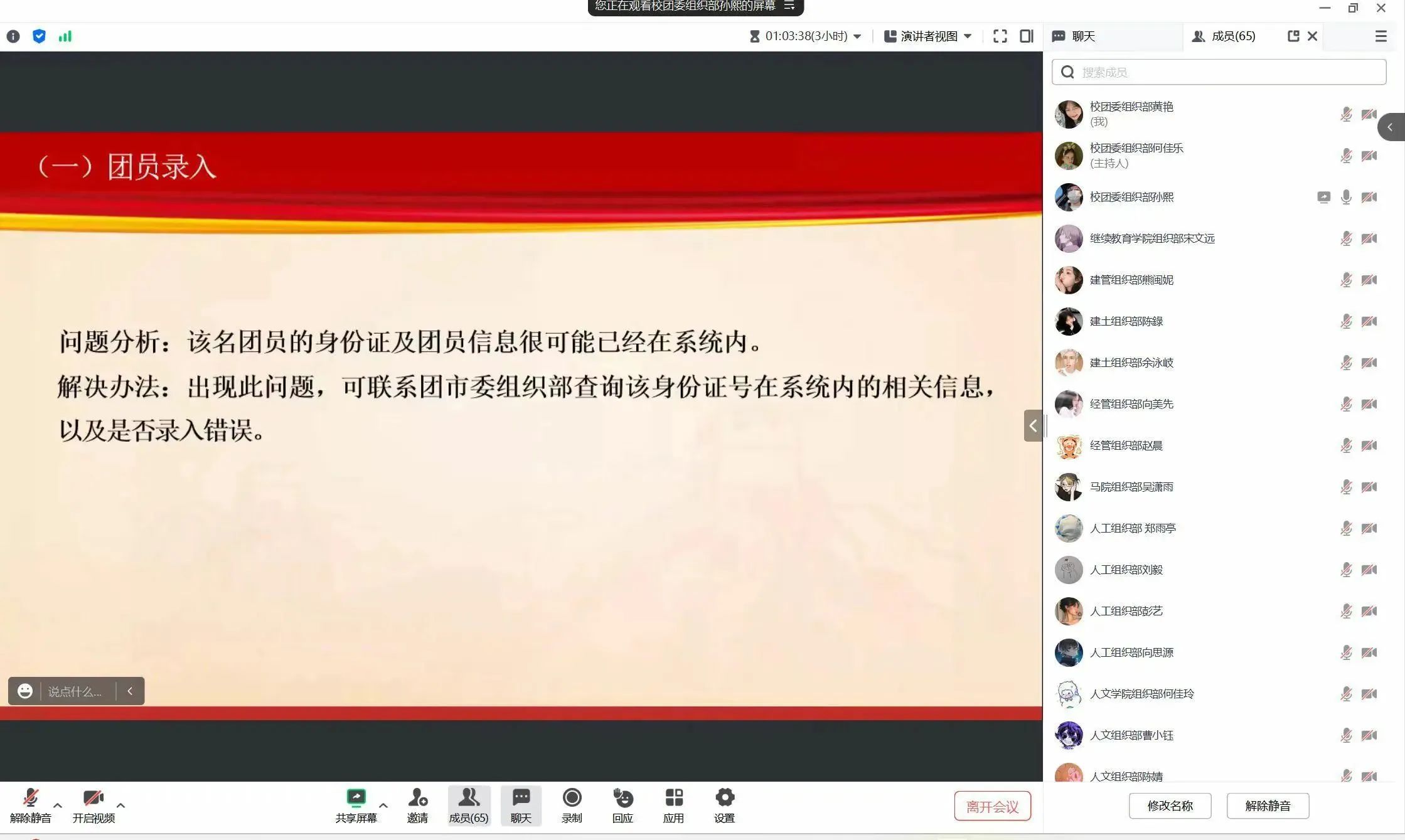 针对团务基础工作,校团委组织部各组负责人对青马工程、团支书背靠背测评、团日活动、“智慧团建”系统及新发展团员的工作规范及注意事项进行了详细的讲解,有利于后期团务工作的顺利开展。对智慧团建平台中的教育实践及数据、干部管理、权限管理与团日管理等栏目的功能进行了细致的示范并对工作中遇到的常见问题提出解决方法,提升了各负责人团务工作的能力。