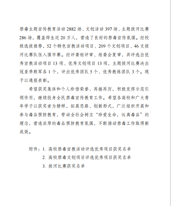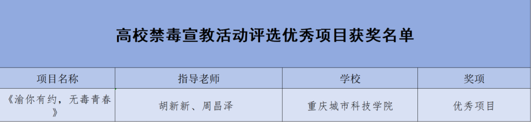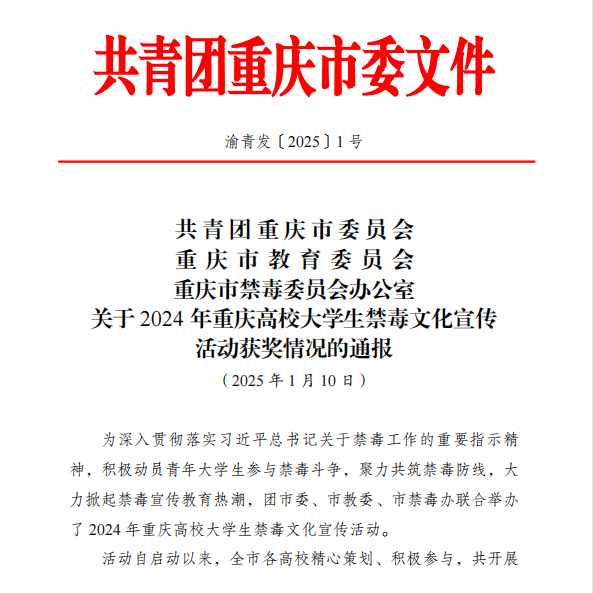 为深入贯彻落实习近平总书记关于禁毒工作的重要指示精神,积极动员广大青年,增强识毒、防毒、拒毒能力,加大预防校园毒品力度,保护学生群体的健康和未来,营造健康安全的校园环境,聚力共筑禁毒防线,团市委、市教委、市禁毒办联合举办了2024年重庆高校大学生禁毒文化宣传活动。重庆城市科技学院“渝你有约,无毒青春”项目荣获高校禁毒宣教活动评选优秀项目佳绩。