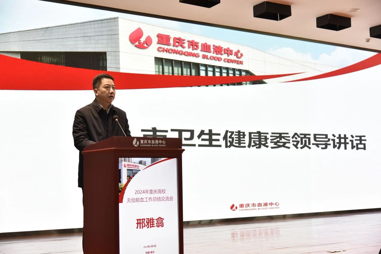 本次会议由市血液中心党委书记李顺平主持。市血液中心主任徐永柱介绍了2024年度高校无偿献血工作的开展情况。会上,团市委志愿服务工作指导中心党支部副书记贺伟、市教委二级巡视员陈渝、市卫生健康委副主任邢雅翕分别讲话,肯定了各高校在献血工作上取得的成绩,并对下一步高校无偿献血工作进行了总体部署。
