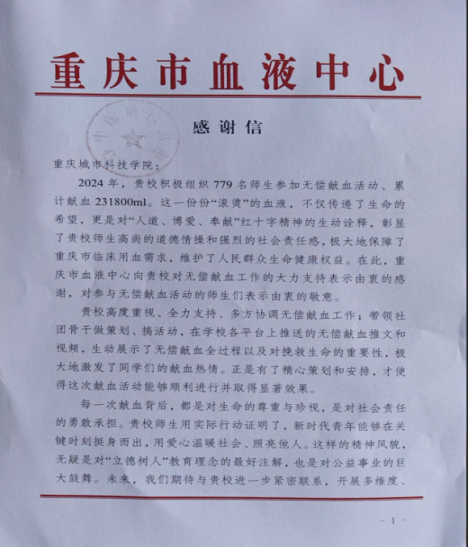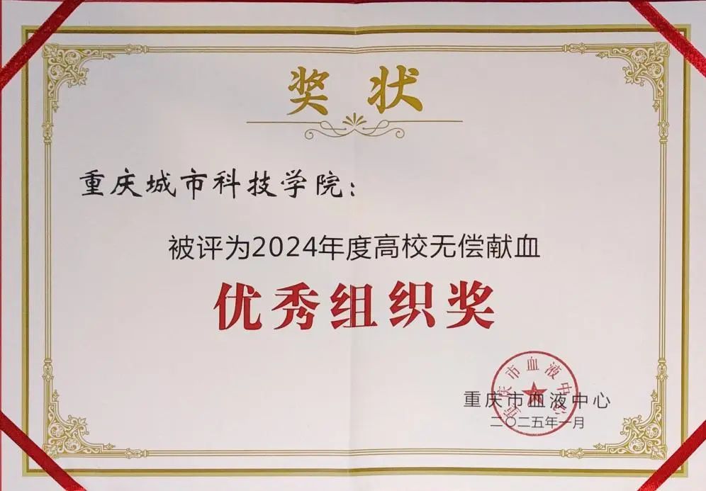 喜报 | 重庆城市科技学院荣获重庆市2024年度高校无偿献血优秀组织奖