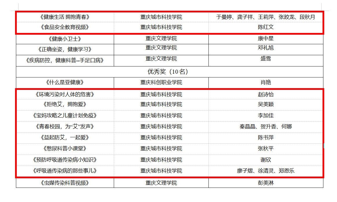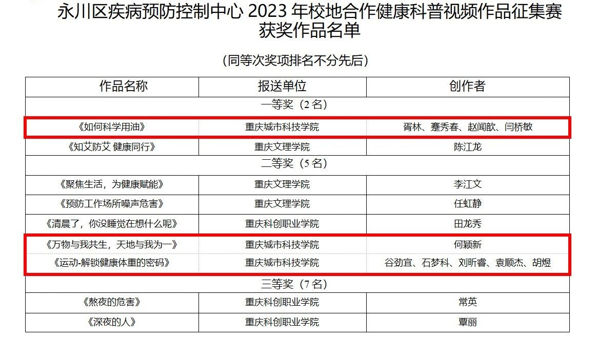 为进一步推动永川区健康教育与健康促进工作,提高永川区的健康教育工作质量,大力普及健康知识与技能,切实提升居民健康素养水平,12月1日,由重庆市永川区疾病预防控制中心举行的2023年健康科普作品征集活动颁奖仪式顺利举行,经我校团委精心组织,各二级学院积极响应、踊跃参与,遴选上报的一批作品中,取得一等奖1名,二等奖2名,三等奖2名,优秀奖8名的好成绩。