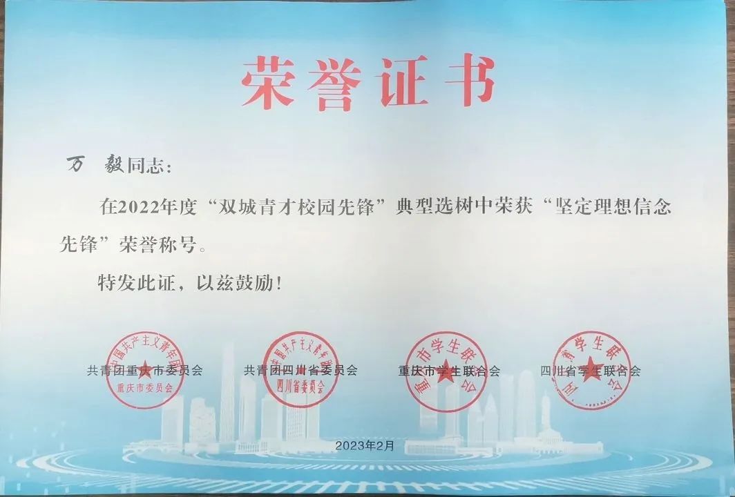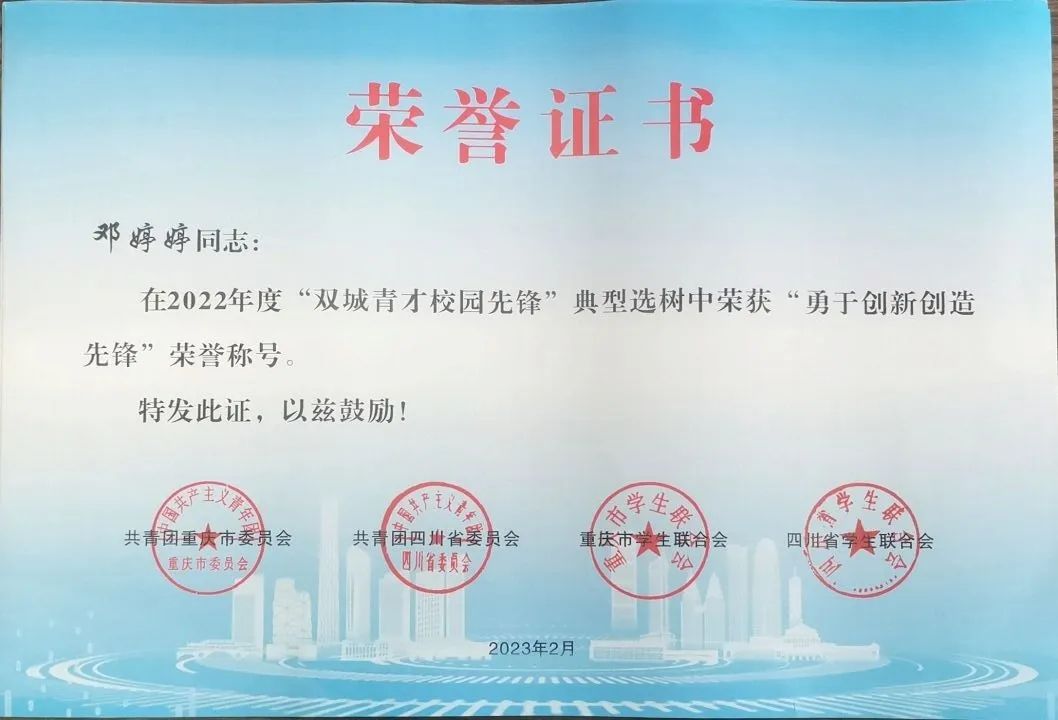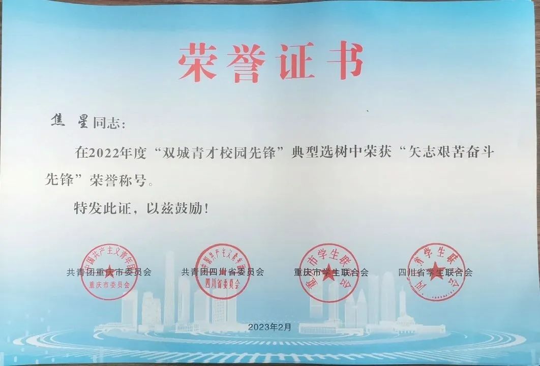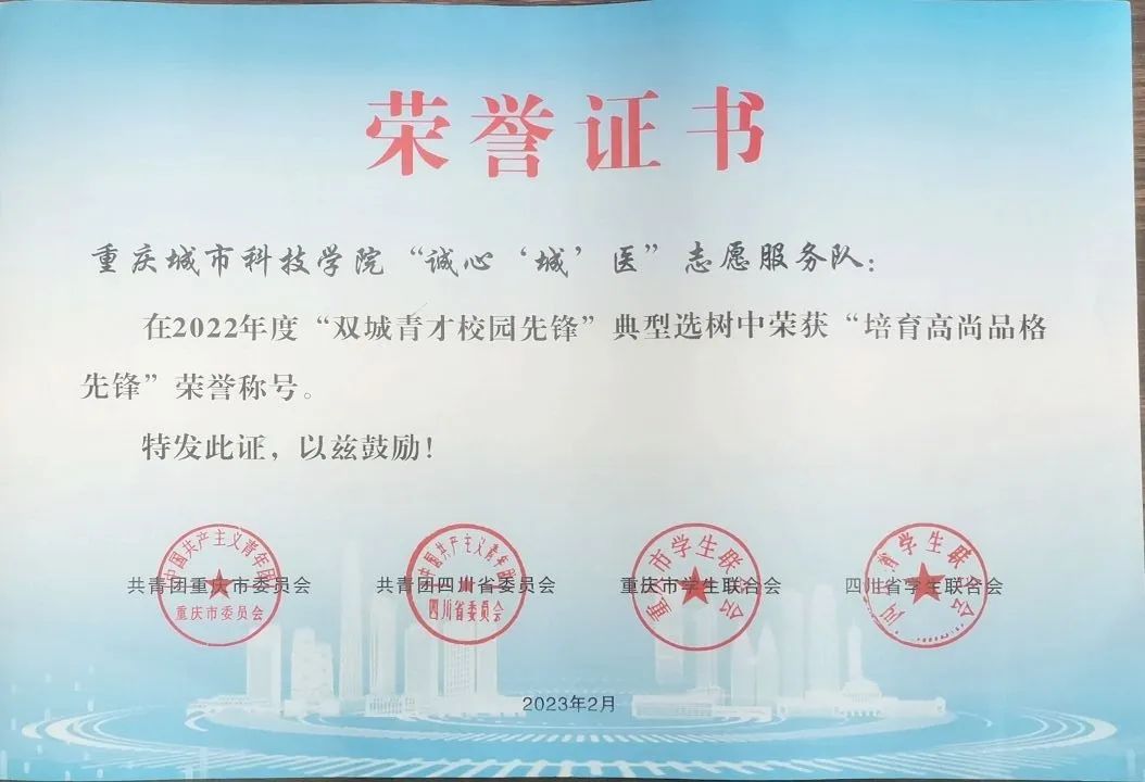 为深入学习贯彻习近平总书记关于青年工作的重要思想,进一步加强思想政治引领,充分展示新时代川渝青年师生奋发有为、积极向上、勇于担当的精神风貌,引导广大青年师生永远跟党走、奋进新征程,共青团重庆市委、共青团四川省委、重庆市学联、四川省学联联合开展2022年“双城青才校园先锋”典型选树活动。我校团队和个人成功入选。其中,“诚心‘城’医”志愿服务队荣获“培育高尚品格先锋”荣誉称号,团委书记、学生处副处长万毅荣获“坚定理想信念先锋”荣誉称号,大学生就业指导中心老师邓婷婷荣获“勇于创新创造先锋”荣誉称号,2018级经济管理学院市场营销专业学生焦星荣获“矢志艰苦奋斗先锋”荣誉称号。