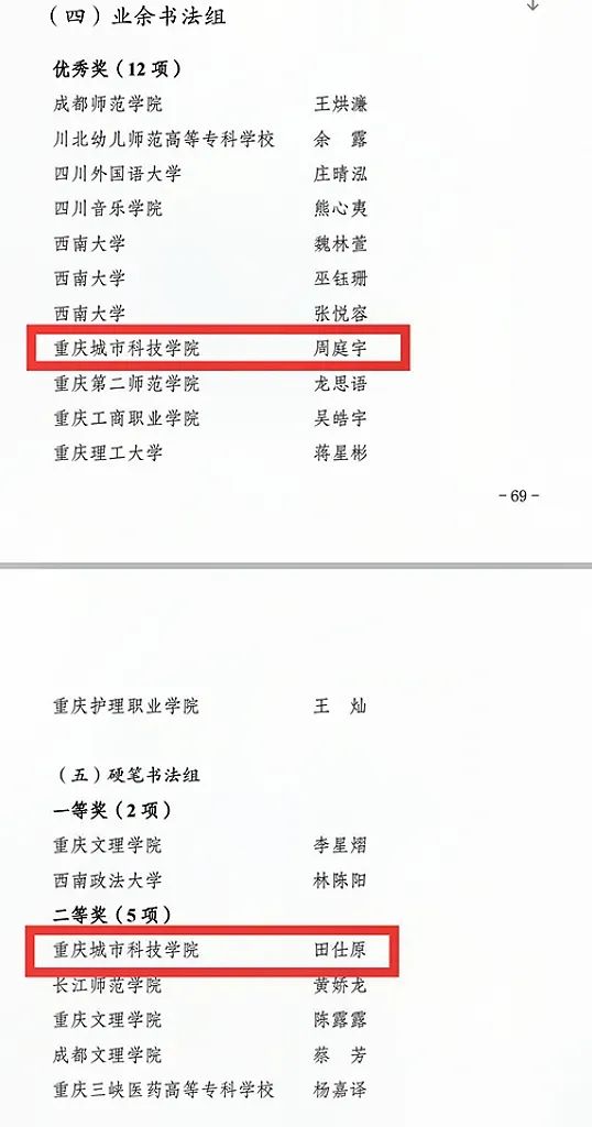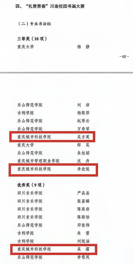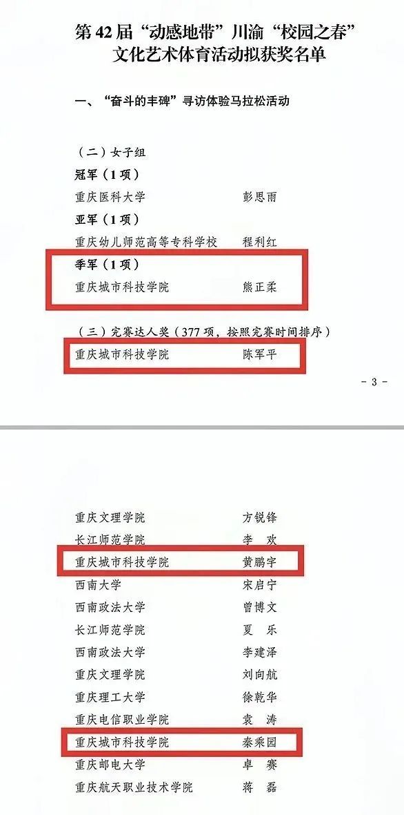 为扎实开展学习贯彻习近平新时代中国特色社会主义思想主题教育,深入学习宣传贯彻党的二十大精神,不断改革创新学校团学工作,切实增强思想政治引领实效,我校团委组织广大青年参与第42届“动感地带”川渝“校园之春”文化艺术体育活动。其中,学生熊正柔荣获“奋斗的丰碑”寻访体验马拉松活动女子组季军,学生陈军平、黄鹏宇、秦乘园、陆俊荧、聂巧荣获完赛达人奖;学生吴方英、李欣悦荣获“礼赞青春”川渝校园书画大赛专业书法组三等奖,学生吴霜荣获专业书法组优秀奖,学生范跃荣获业余国画组二等奖,学生周庭宇荣获业余书法组优秀奖,学生田仕原荣获硬笔书法组二等奖。