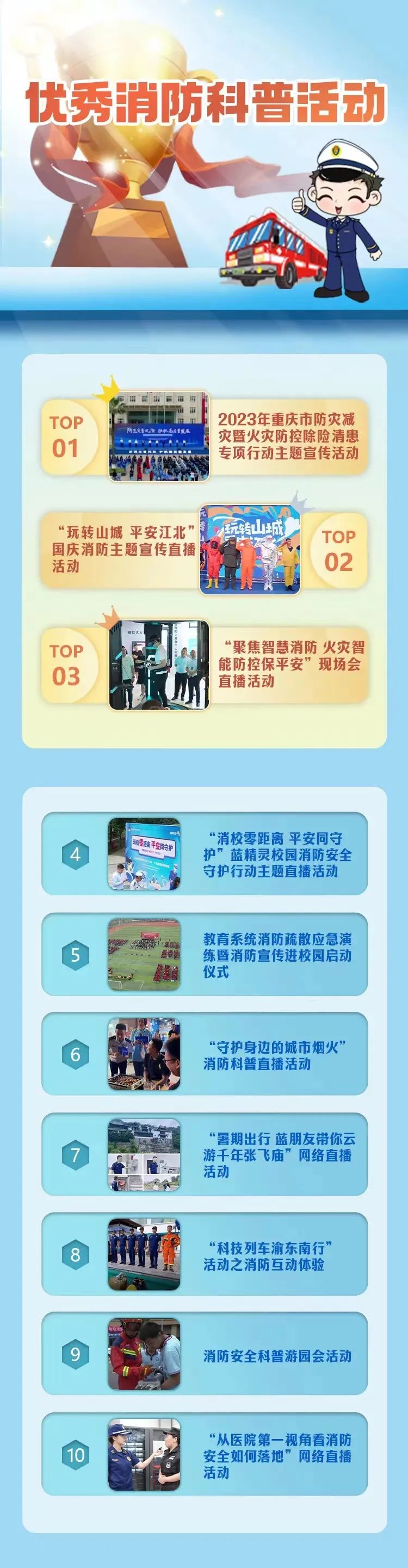 为促进全市消防科普工作统筹发展,提升消防宣传策划组织能力,推广消防知识普及,提高全民消防安全素质。重庆市消防安全委员会办公室开展了2023年优秀消防科普活动评选,经单位申报、专家评审、网络投票最终评选出十个优秀消防科防活动。重庆城市科技学院承办的“消防零距离,平安共守护”·蓝精灵送平安直播活动项目在此次活动中荣获第四名!