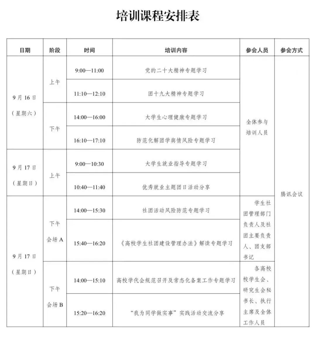 本次专题培训会主要围绕学习党的二十大精神、团十九大精神、大学生心理健康、防范化解团学舆情风险、大学生就业指导、优秀就业主题团日活动分享、社团活动风险防范、《高校学生社团建设管理办法》解读、高校学代会规范召开及常态化备案工作专题学习、“我为同学做实事”实践活动交流分享等内容展开。