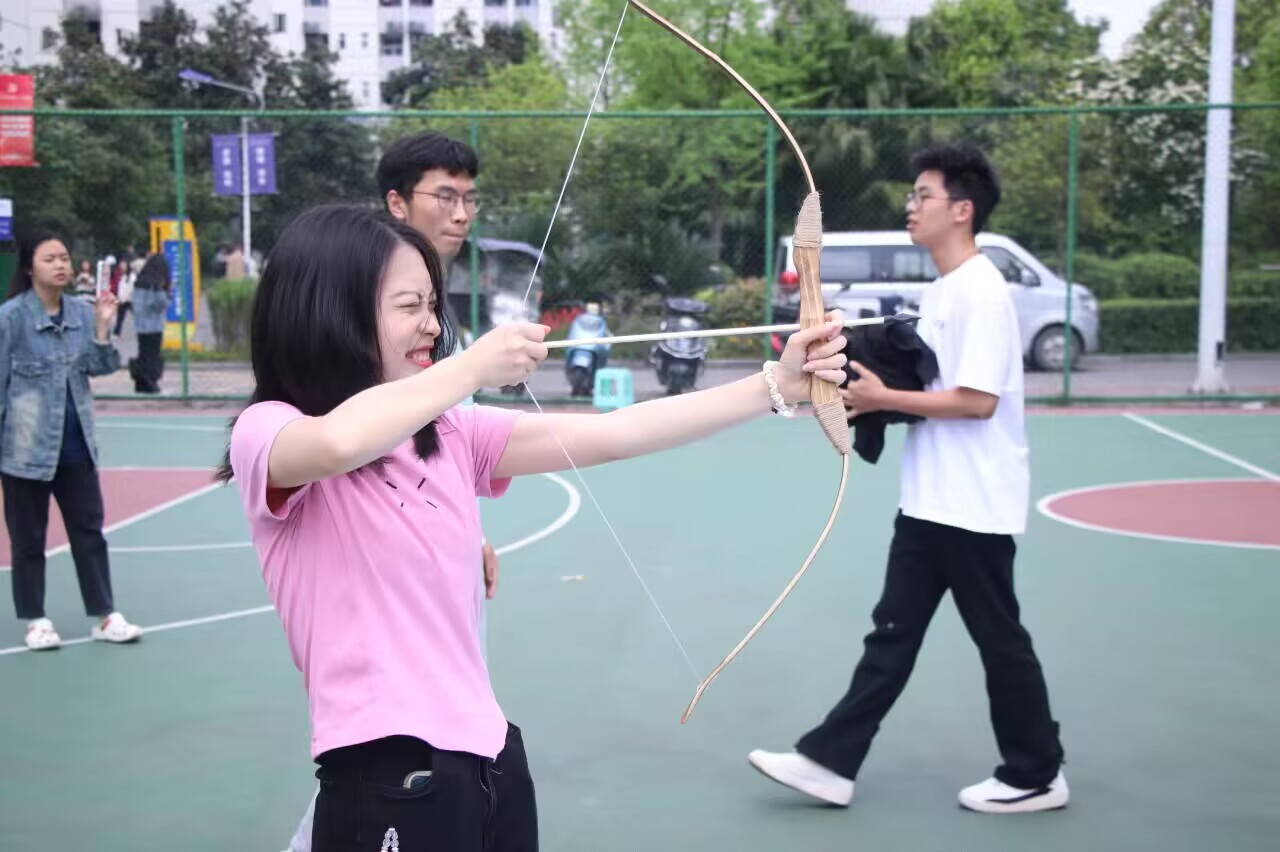 与春有约,共赴百花宴。开幕式结束后,要问同学们最期待的是什么?那当然是逛“国风雅集”啦!首先镜头来到欢乐弥漫的游戏区域。在蹴鞠游戏中,参赛者们密切配合,动作行云流水;环顾四周,射箭项目也在火热进行,射手稳稳地举弓,弓弦在指尖跳跃,箭矢瞬间飞驰;参加投壶的同学也不甘示弱,屏息瞄准,投中后尽展笑颜;手握绳索用力抽打,陀螺犹如一个急速旋转的星球,引得人拍手叫绝。各类古风游戏精彩纷呈,让同学一键get古代民间同款娱乐方式。