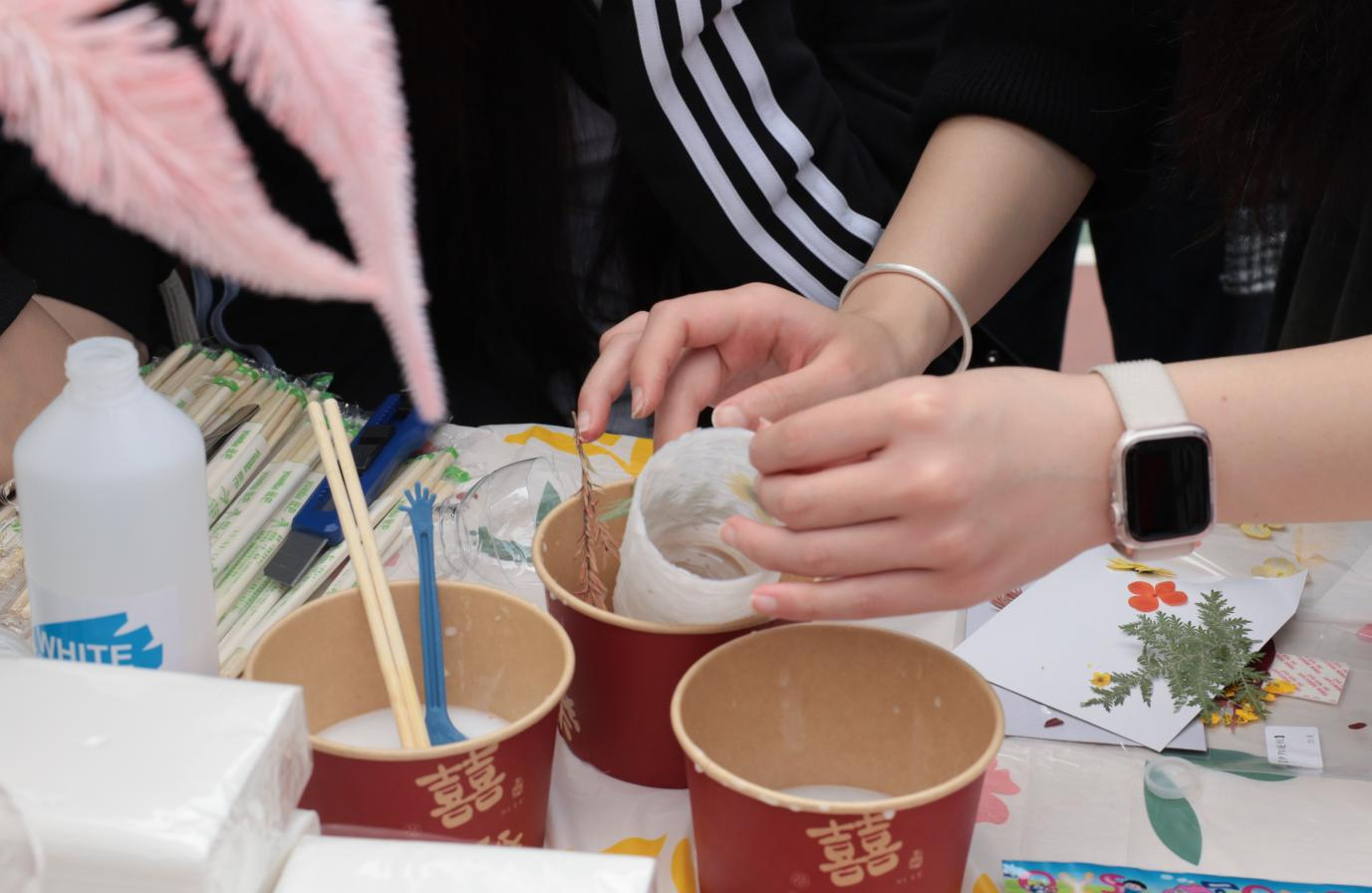 接着,镜头转移来到非遗手作区。同学们带着好奇探索着非遗文化之美,把浪漫和春天簪在头上,簪得满头锦绣;丝丝线线于指尖缠绕,栩栩如生的花朵呈现眼前;花与面的交相辉映,一把充满诗意和淡雅的压花团扇于眼前浮现,轻轻摇晃,微风带来春天的韵味;将花草缀入纸浆,锁住草木柔情,由此成就独具传统韵味的花草纸灯笼;花瓣层层交叠在纸上,颜色渗透入纸中,带来自然与艺术的完美结合品—花草纸。
