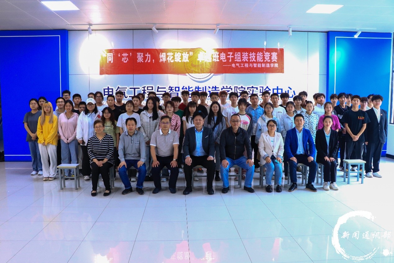 为激发同学们对电子技能领域的兴趣和热爱,提升学生的创新能力、协作精神、工程实践能力及动手能力。5月11日中午12:30,电气工程与智能制造学院于三期综合实验楼403-1与403-2教室开展“同‘芯’聚力,焊花绽放”首届卓越班电子组装技能竞赛,并于104教室举行了开幕式,学院首届卓越班38名学员及电子系14名学员,共计52名学生参与了本次比赛。电气工程与智能制造学院党总支副书记李晓飞,常务副院长潘银松出席本次活动,开幕式由陈正丽老师主持。
