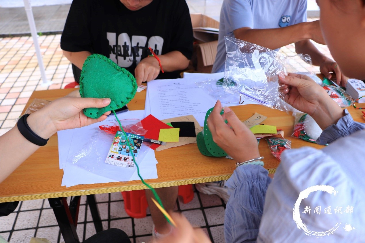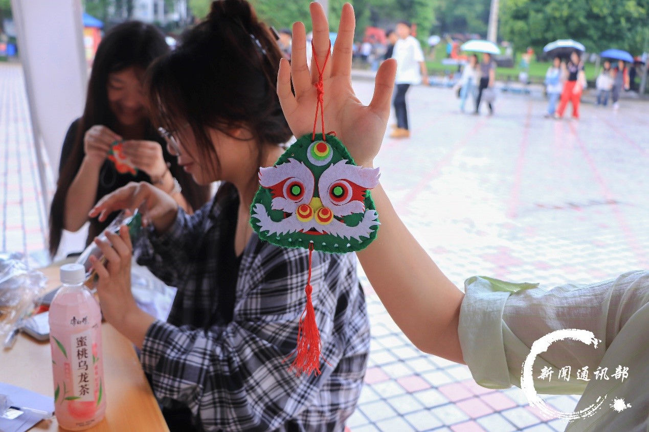 志愿者早早做好了准备,只为让同学们有更好的活动体验。活动现场,同学们积极报名参加,通过经典诗词问答纪念屈原,在诗词文化的古今碰撞中感受屈原的爱国精神,欣赏中国古代诗歌的魅力。在制作手工香囊时,同学们一边根据图解研究缝制步骤,一边拿起针线小心翼翼地缝着,一针一线传承着中华习俗;缝制完成后往香囊里装入艾叶,香囊立体饱满,一个个造型独特的香囊代表着同学们对传统节俗的喜爱。