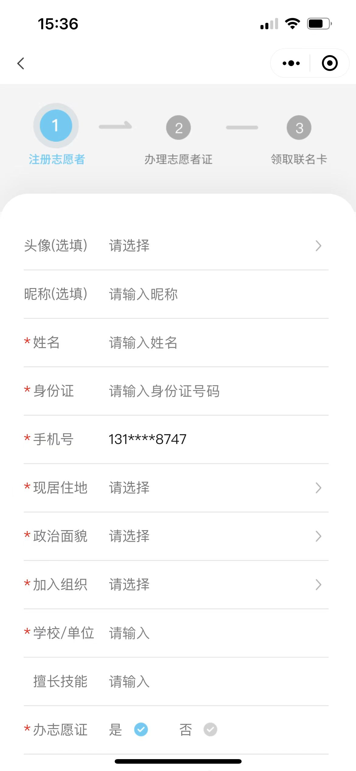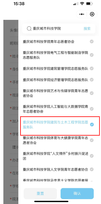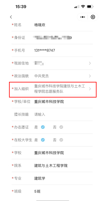 步骤四:填写基本信息(注意加入组织一定要选重庆城市科技学院建筑与土木工程学院志愿服务队)