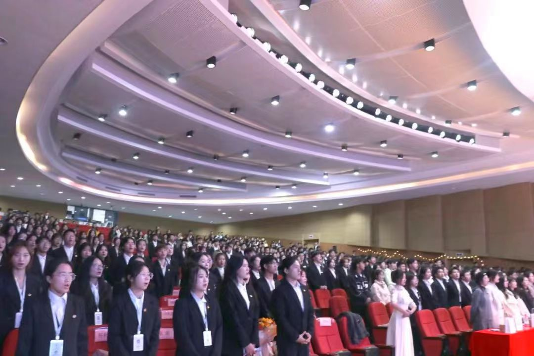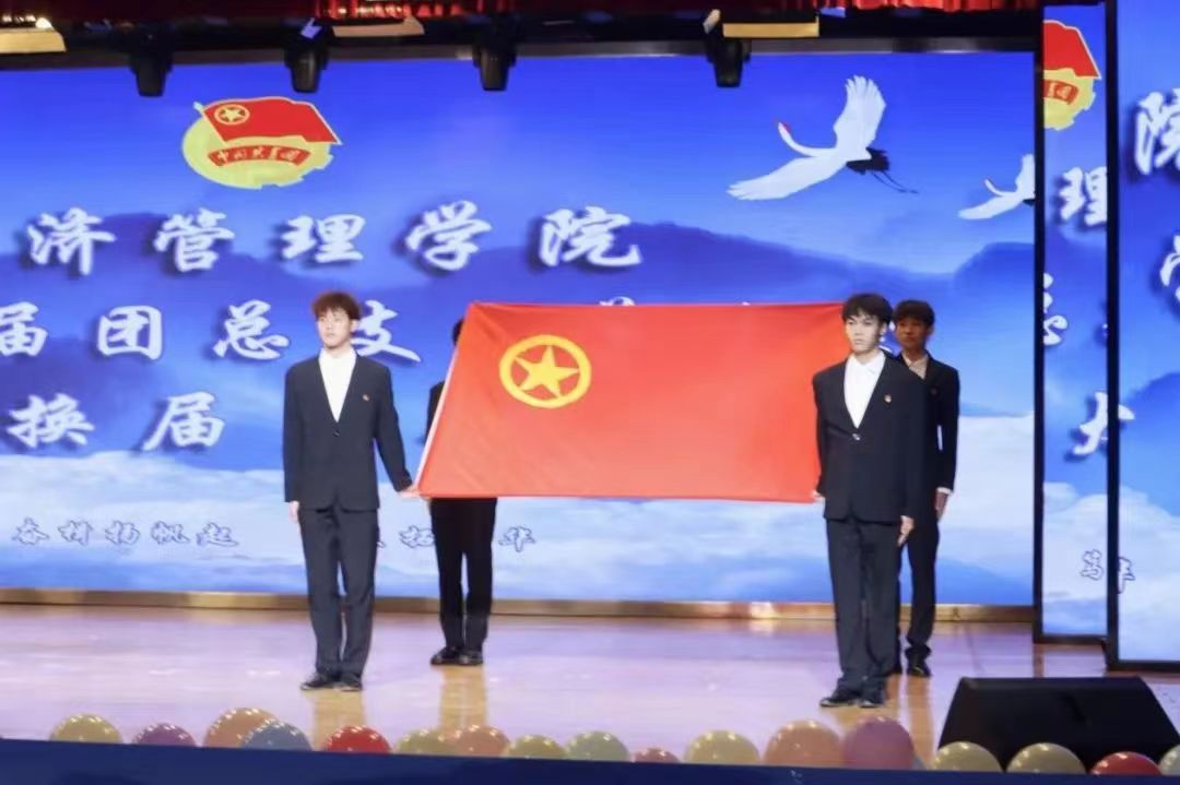 全体与会人员起立,迎团旗,唱团歌,铿锵有力的歌声久久回荡,展现出属于经管团学人的朝气与蓬勃。