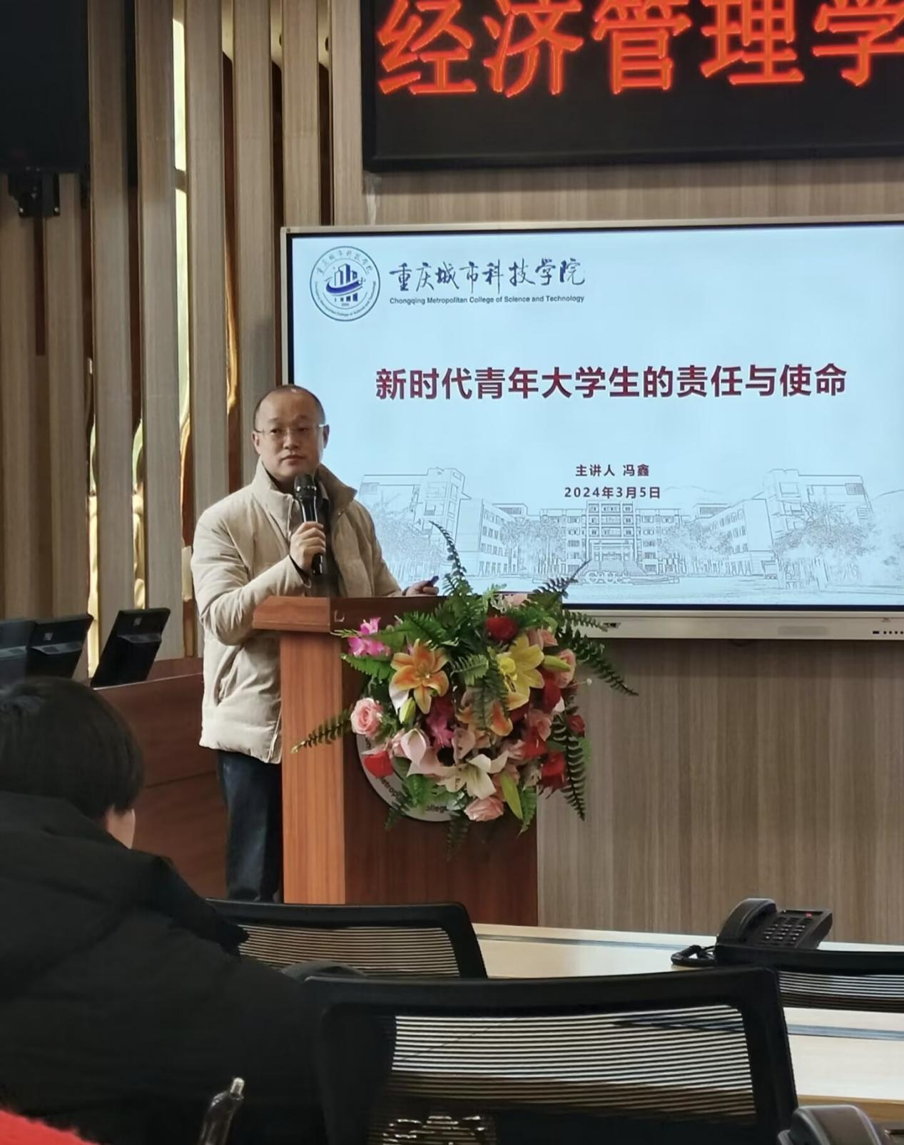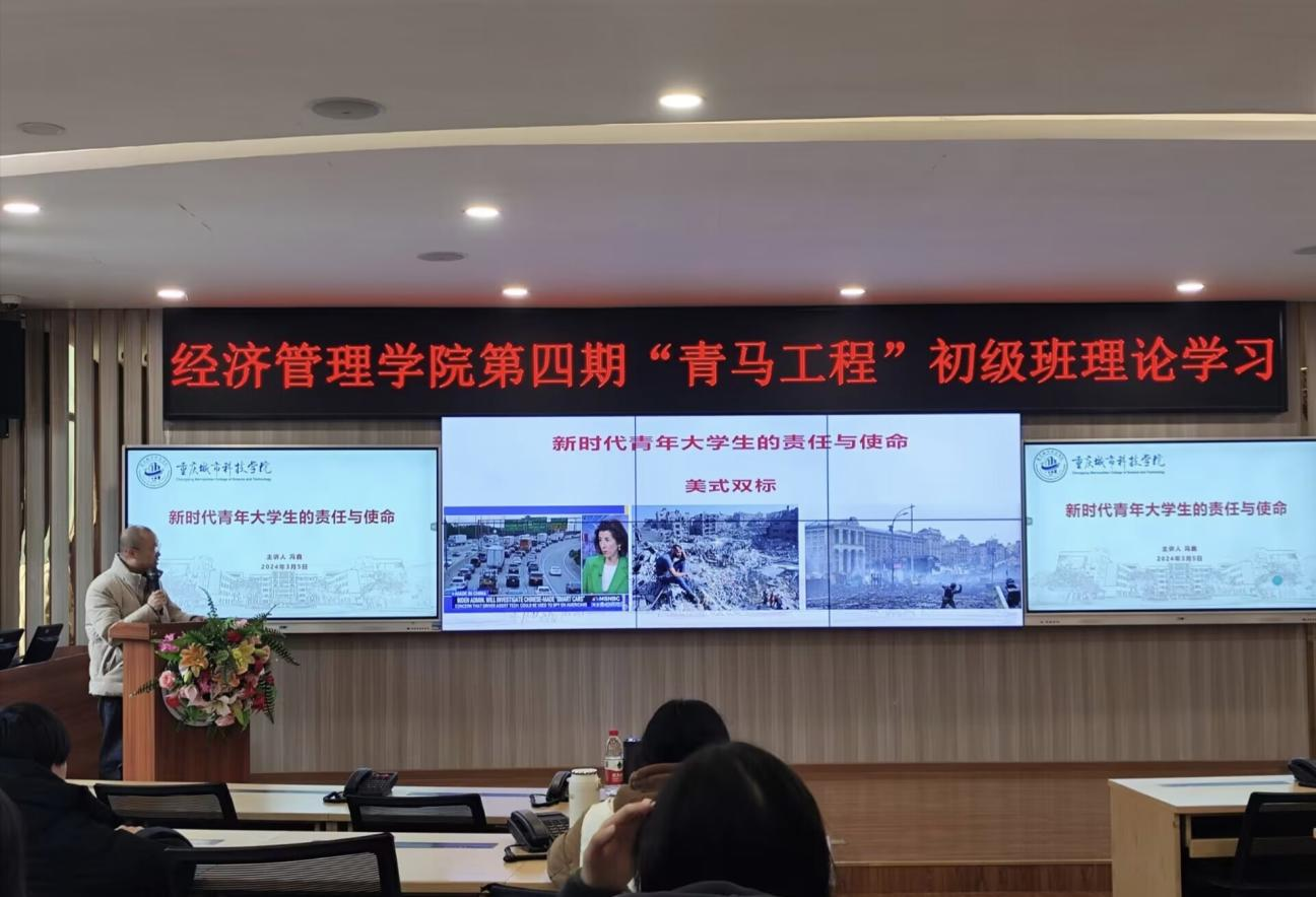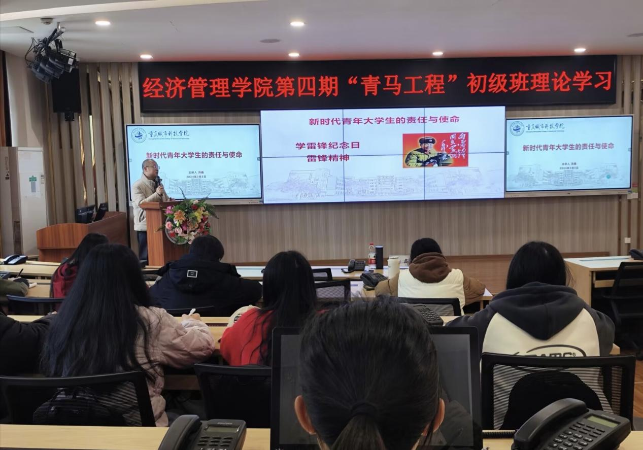 为深入学习贯彻习近平总书记关于一代人有一代人的使命重要讲话精神,引导广大青年发扬斗争精神、增强斗争本领,进一步发挥青年模范带头作用,经济管理学院第四期“青马工程”初级班于3月5日中午12:30在六教金融仿真中心开展以“新时代青年大学生的责任与使命”为主题的理论学习。本次理论学习由经济管理学院党总支书记、副院长冯鑫主讲,团学指导老师黄怡出席,初级班全体学员参加。