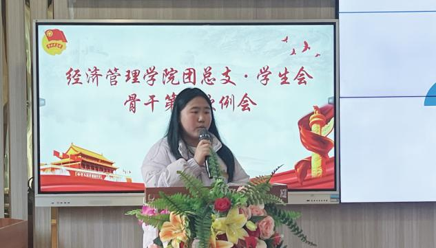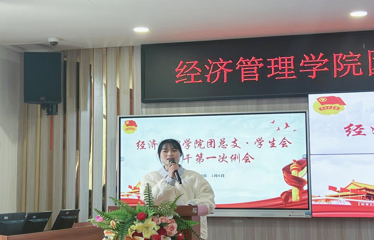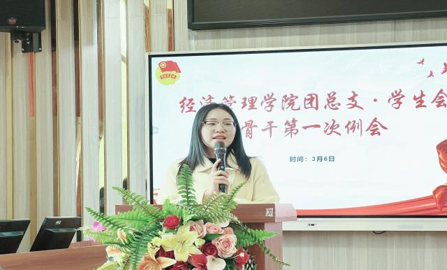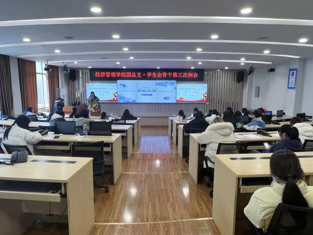 为进一步加强我院团总支·学生会队伍建设,提高学院团学骨干整体素质和工作能力,保障新学期各项工作顺利开展,经济管理学院团总支·学生会于3月6日12:30在6教金融仿真中心召开本学期第一次骨干例会。本次会议由团总支书记龚宇梦,团学指导老师黄怡,赵依玲,罗炼,书记处主席团成员及团学全体骨干共同参与,会议由办公室干事王洪伟主持。