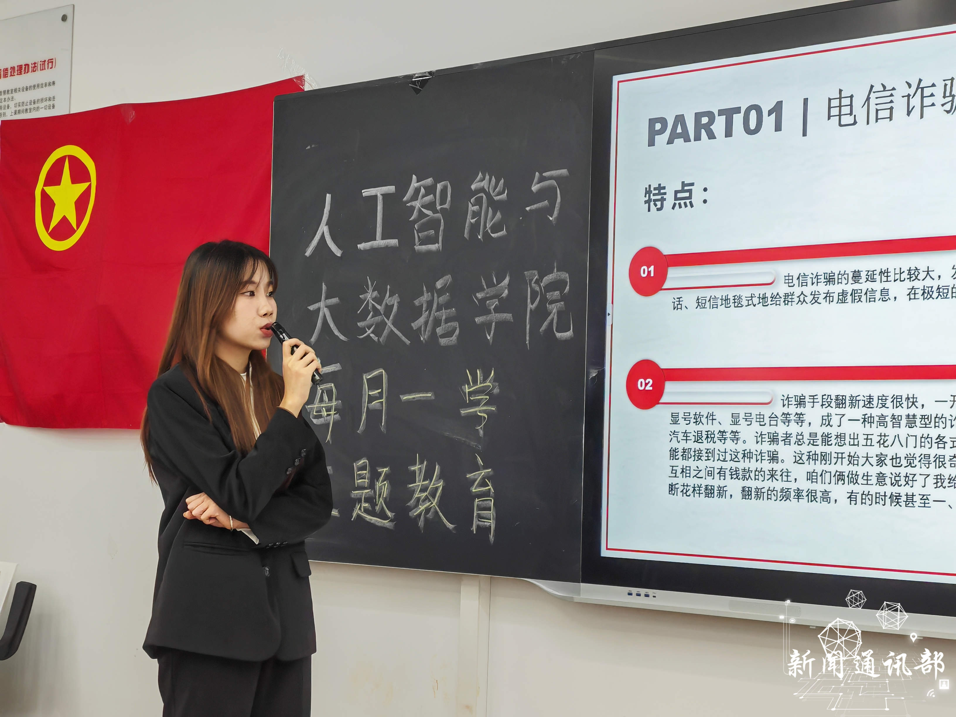 为提高学生网络安全意识,帮助学生了解网络诈骗的危害和常见手法,掌握防范网络诈骗的方法和技巧。12月13日12:30,人工智能与大数据学院于主教204开展以“防范诈骗擦亮眼,拒绝诱惑心不贪”为主题的每月一学活动。本次活动由团学指导老师黄圆圆出席,各学生代表参加,学生会主持部罗颜担任主持人。
