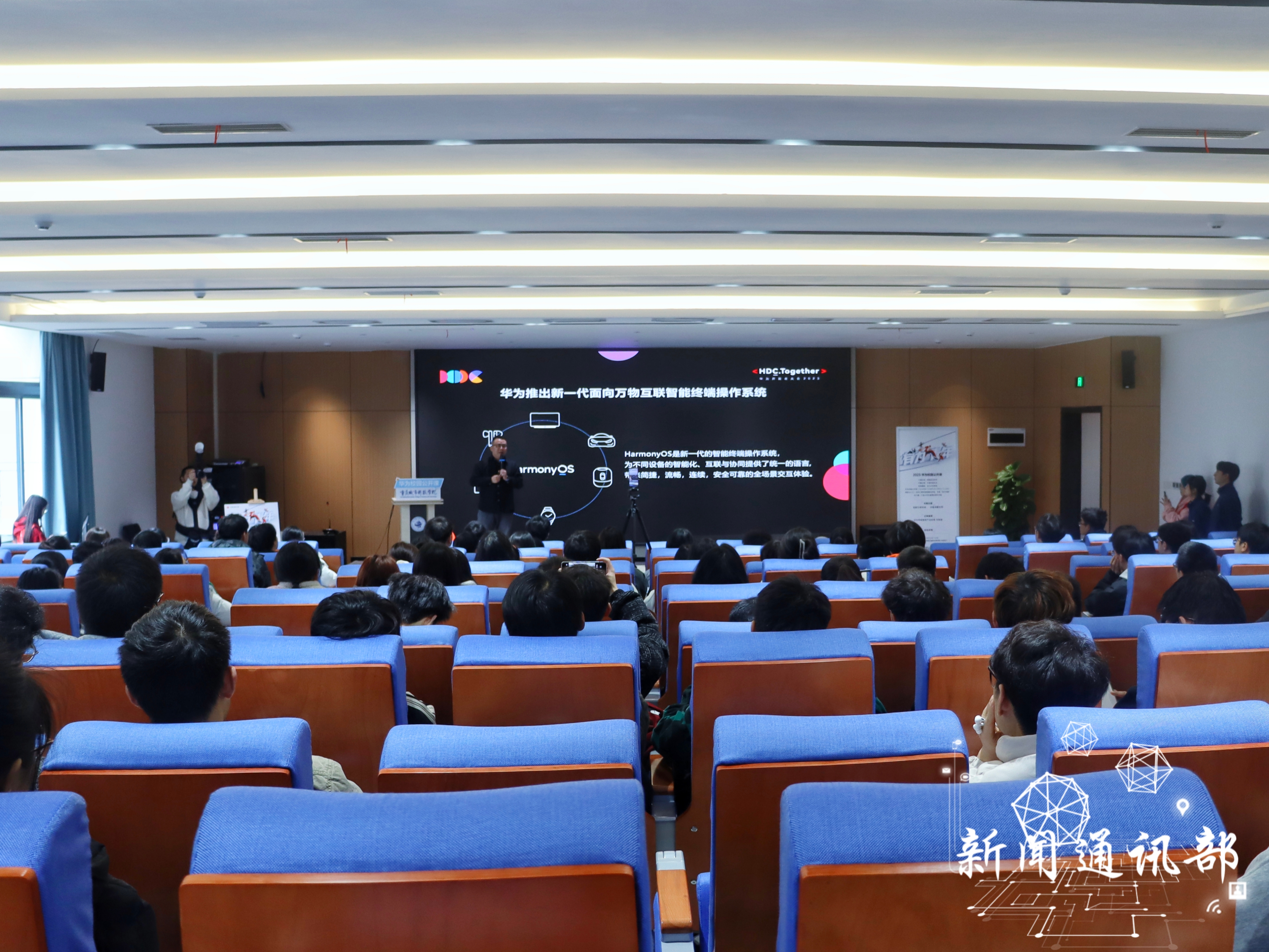 讲座开始,刘老师以“创新引领未来·共建鸿蒙世界”为主题,深入浅出地讲解华为HarmonyOS创建理念、技术特点等核心内容,分享科技创新的最新动态,并与同学们交流自身体验HarmonyOS系统的感受,展现HarmonyOS系统在超级终端、个性主题等方面的协同特性。
