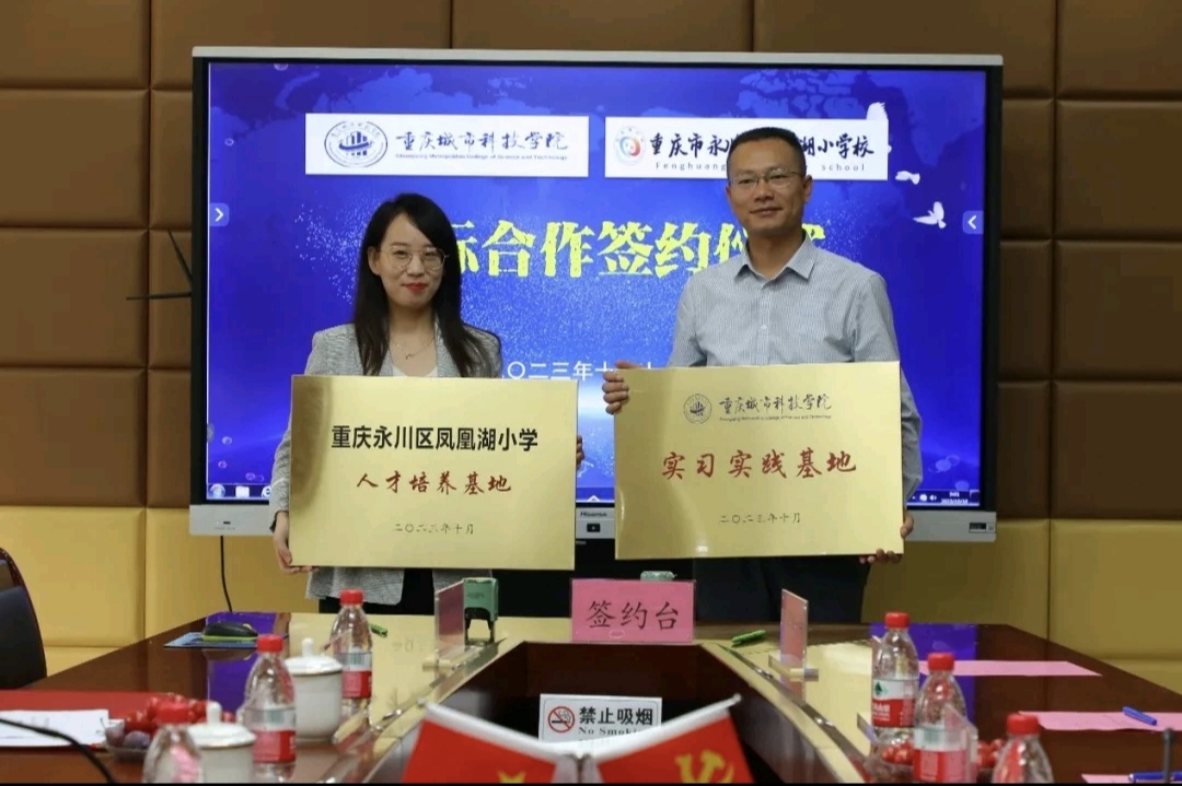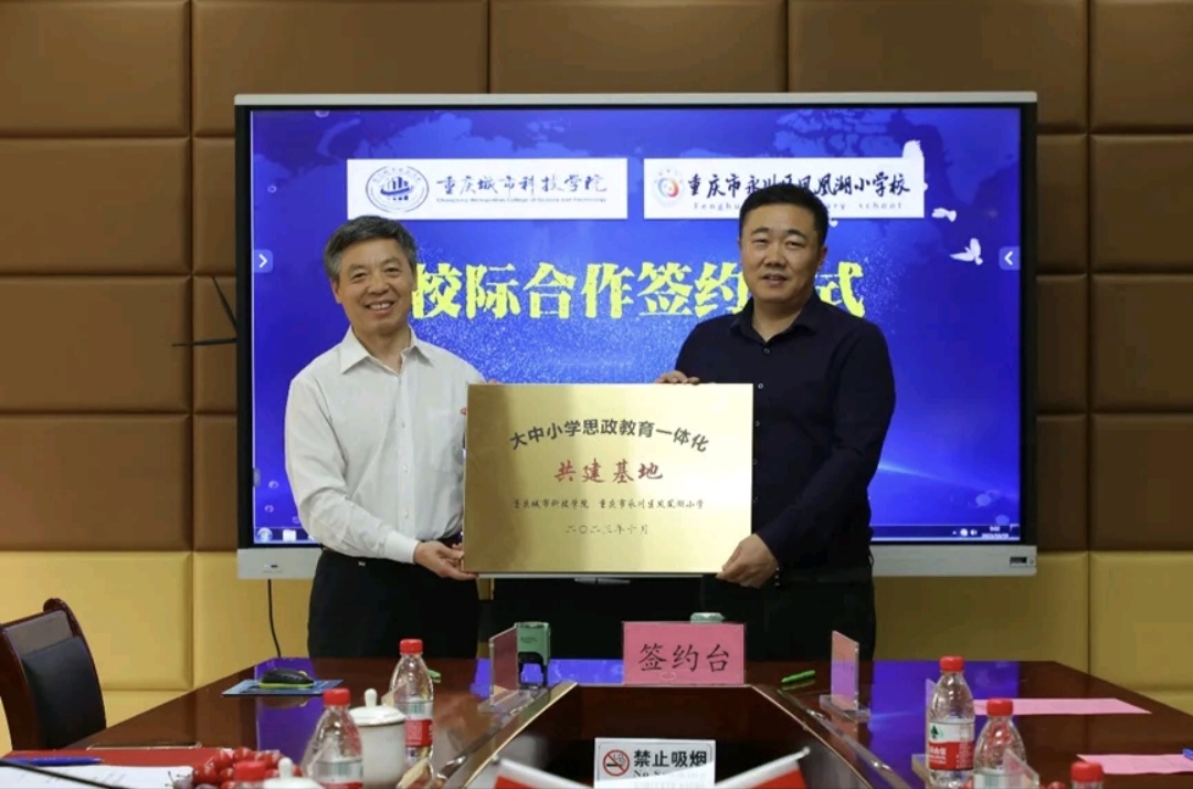 10月18日, 重庆城市科技学院马克思主义学院与重庆市永川区凤凰湖小学合作签约仪式在凤凰湖小学举行。马克思主义学院院长蒋德勤、副院长张沙沙、思想政治教育系副主任张峻铭,凤凰湖小学校党总支书记王传西、副校长陈金洪等共同出席签约仪式。