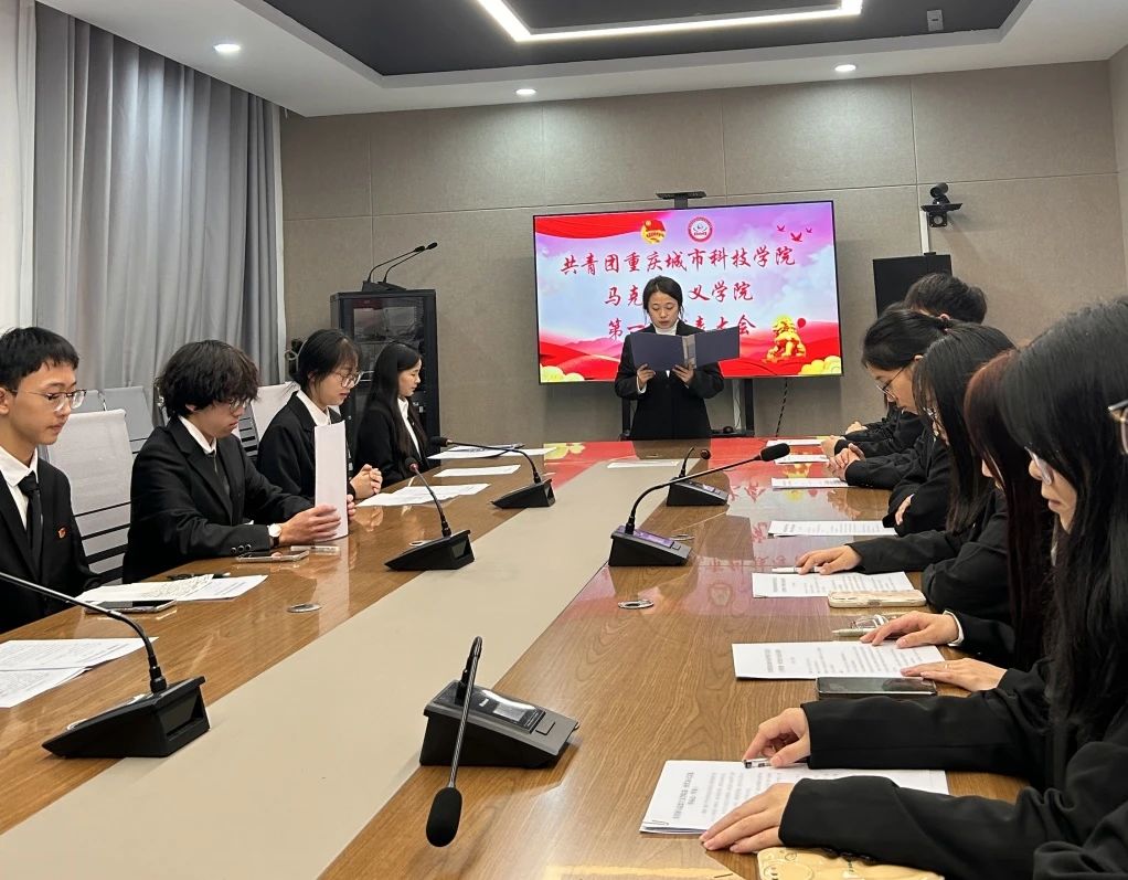 在全党全国深入学习宣传贯彻党的二十大精神,团结带领广大团员青年成为可堪民族复兴大任的时代新人,开启党的第二个百年奋斗伟大征程的关键时期,2023年11月23日晚上20:30,马克思主义学院在会议室召开了共青团重庆城市科技学院马克思主义学院第一次代表大会。出席本次大会的有团学指导老师王乙岚,学院学生会骨干以及全体正式代表和工作人员。