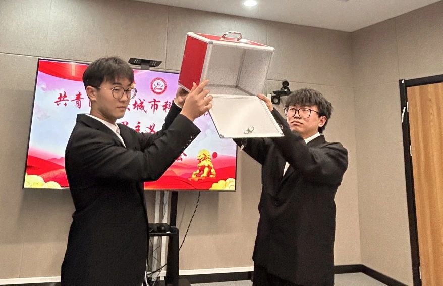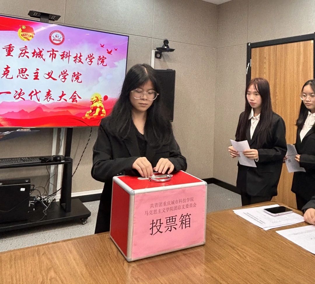 监票员展示投票箱,各学生代表秉持 “公平公正公开” 的原则依次投票表决。在监票人的监督下,经过有序的投票和计票,最终由主持人宣布选举结果,确定了共青团重庆城市科技学院马克思主义学院总支部委员会委员以及出席学校第二次代表大会的代表。