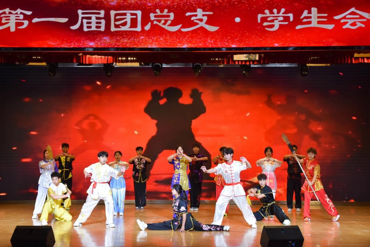 一声鼓响,红幕拉开。体育与大健康学院第一届团总支·学生会换届暨表彰大会正式拉开帷幕。战鼓擂,音乐起,精彩绝伦的武术表演将大会现场推至高潮。台上的身姿潇洒肆意、刚强有力,无不彰显体院学子的青春风采。