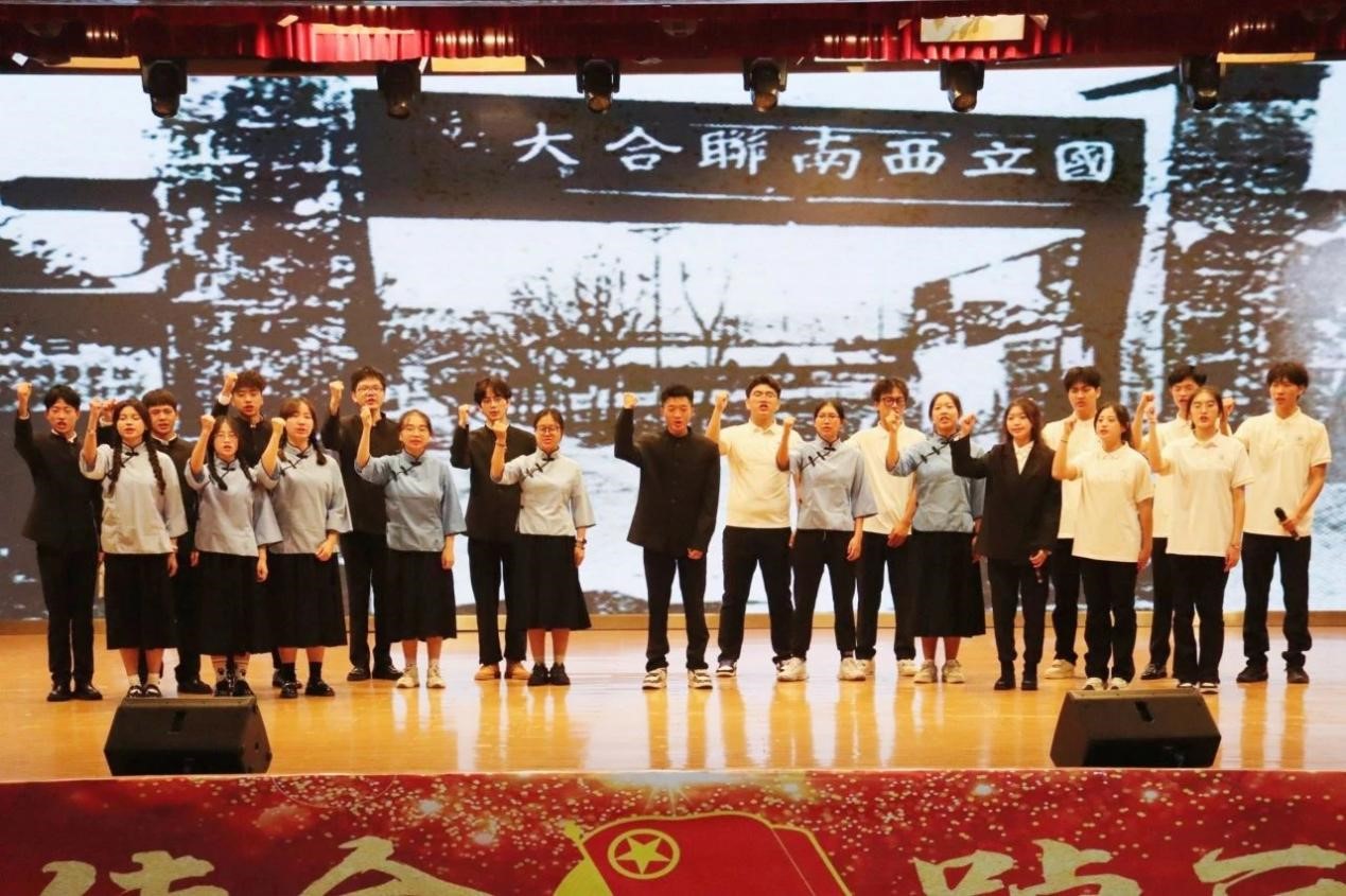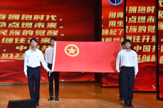 团旗护卫队迈着整齐的步伐,在庄严的氛围中将团旗展开。全体师生起立齐唱共青团团歌。
