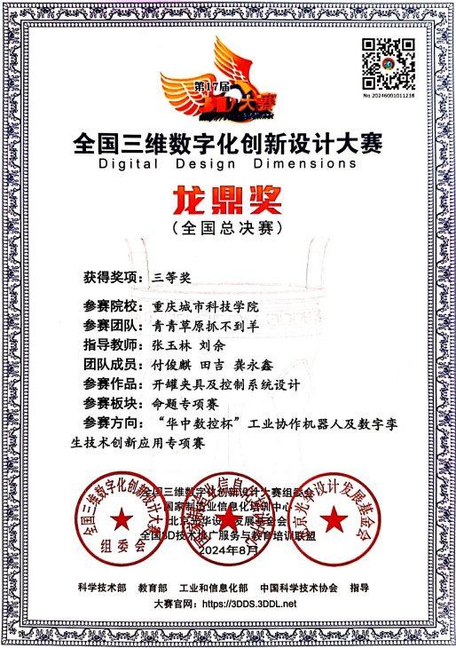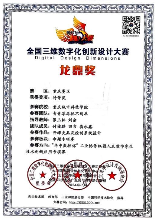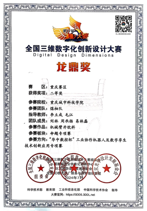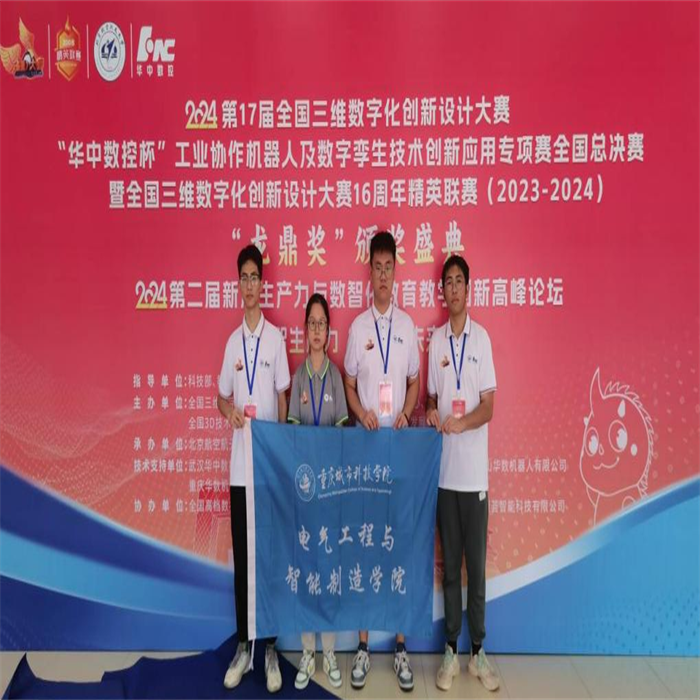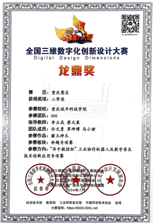 近日,第17届全国三维数字化创新设计大赛(简称“全国3D大赛”)“华中数控杯”工业协作机器人及数字孪生技术创新应用专项赛全国总决赛于北京航空航天大学圆满落幕,本次3D大赛由国家制造业信息化培训中心、北京航空航天大学、全国3D技术推广服务与教育培训联盟、北京光华设计发展基金会、武汉华中数控股份有限公司联合举办。在省赛阶段重庆城市科技学院共8支队伍积极报名,经选拔后共计有4支队伍、12人参加省赛。经现场激烈的实操比拼和答辩环节后最终荣获特等奖1项、一等奖1项、二等奖2项。