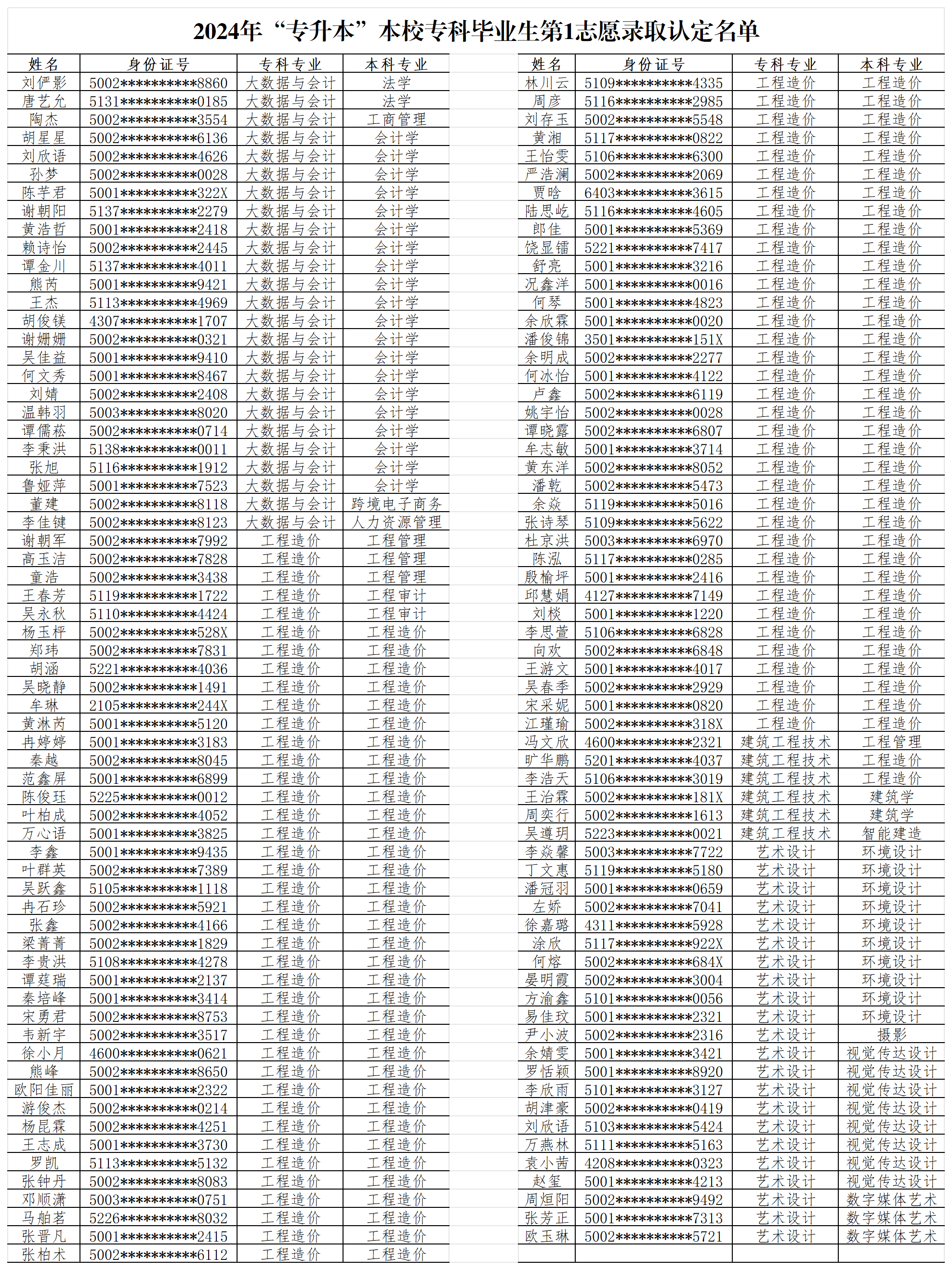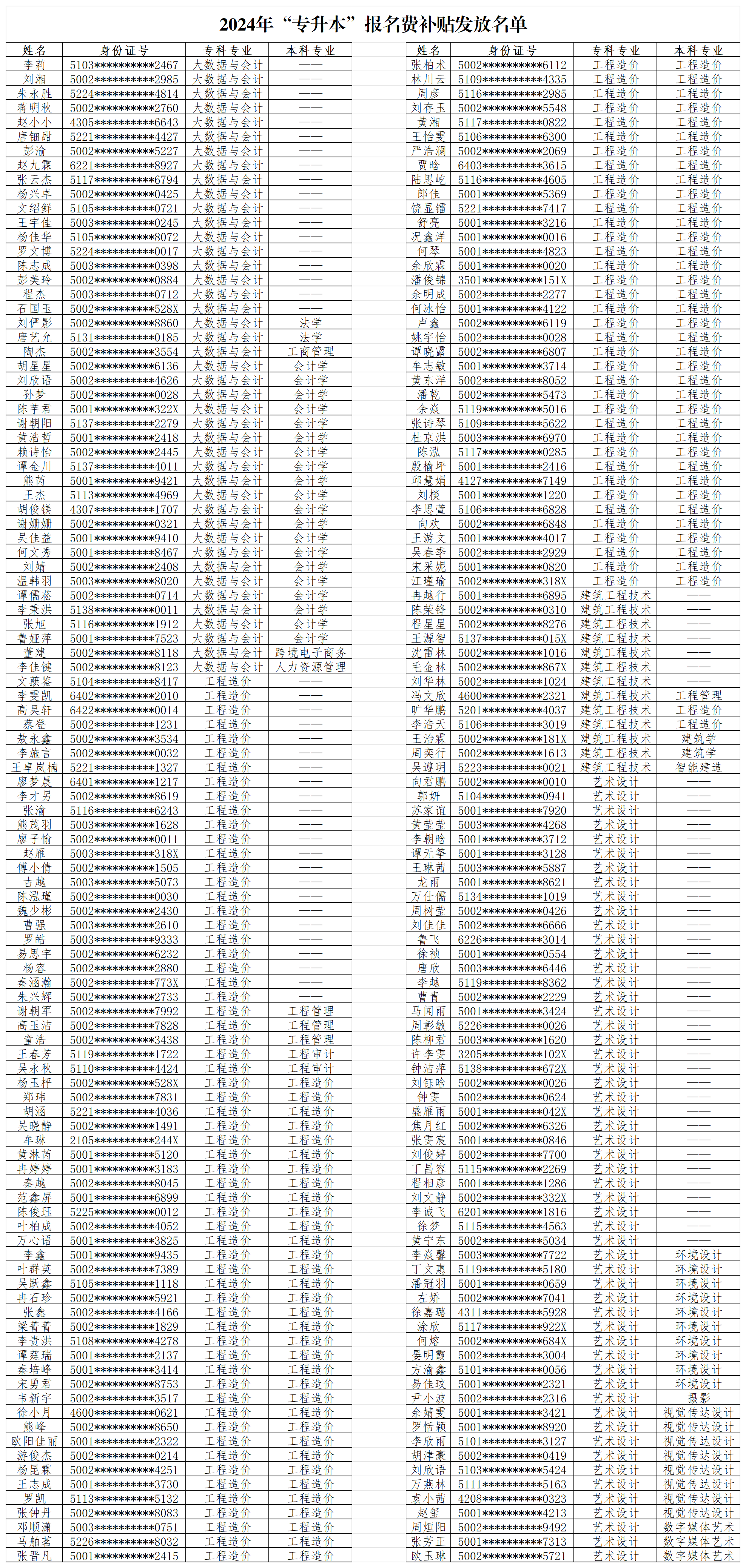 根据《重庆城市科技学院2024年“专升本”工作方案》及《关于积极动员2024届专科毕业生参加“专升本”考试报名工作的通知》,现将2024年“专升本”本校专科毕业生补贴认定名单进行公示。