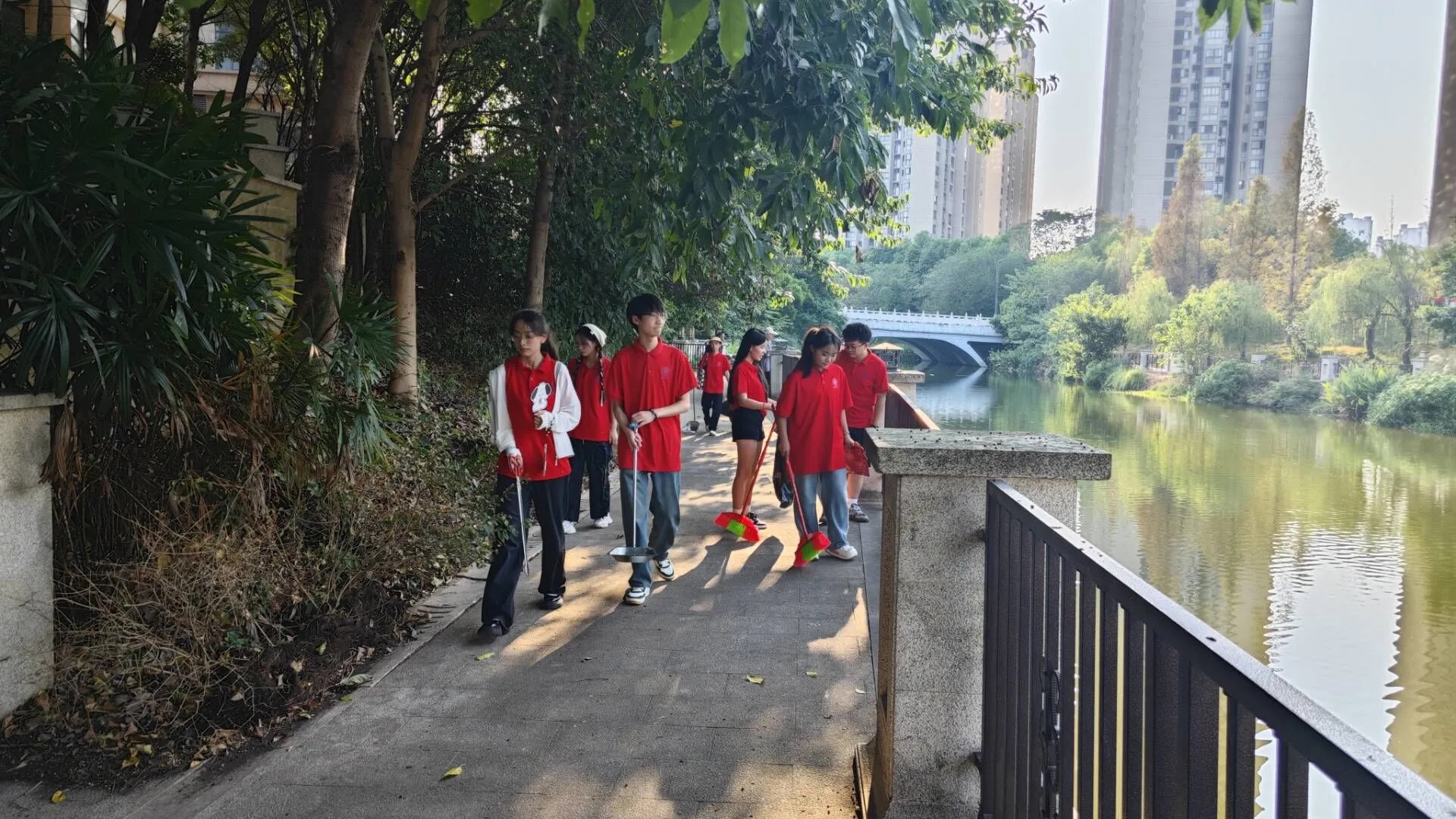 活动分为两组开展活动,一组进行河道清理,“小红人”们手拿工具,分工协作,沿着河道进行巡河、清洁,随手捡、随手护,对河道进行拉网式清理,发扬奉献、互助的志愿者精神;另一组“小红人”们手持宣传册开展国庆主题宣讲,向过往行人介绍国庆的由来、习俗文化,在大街小巷宣扬爱国思想。