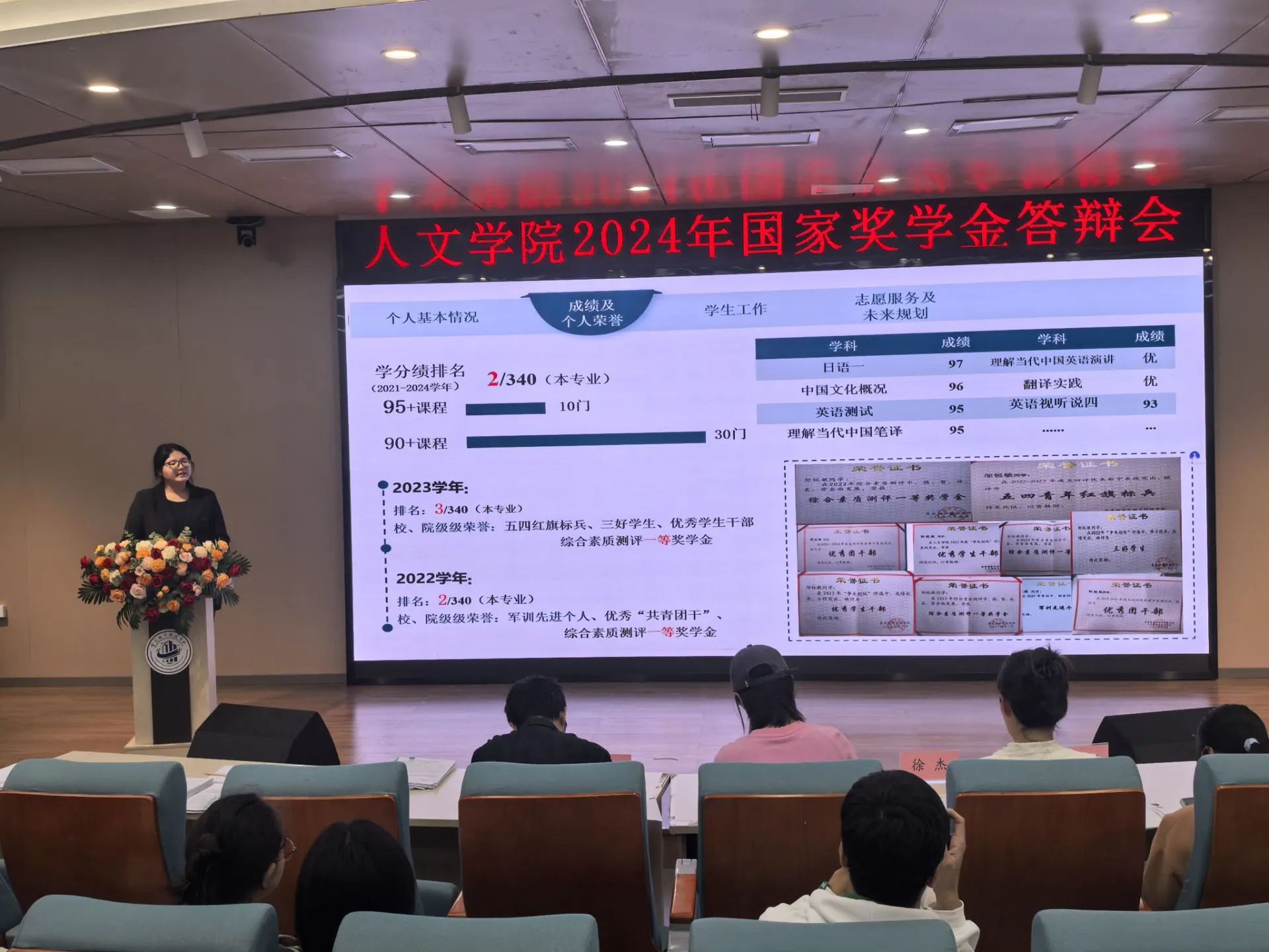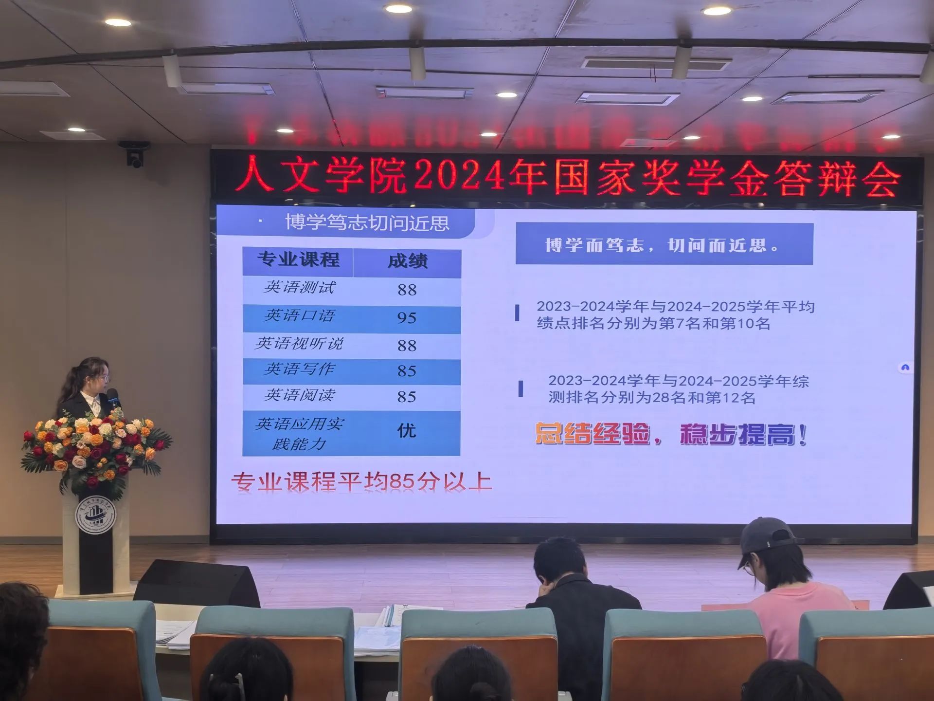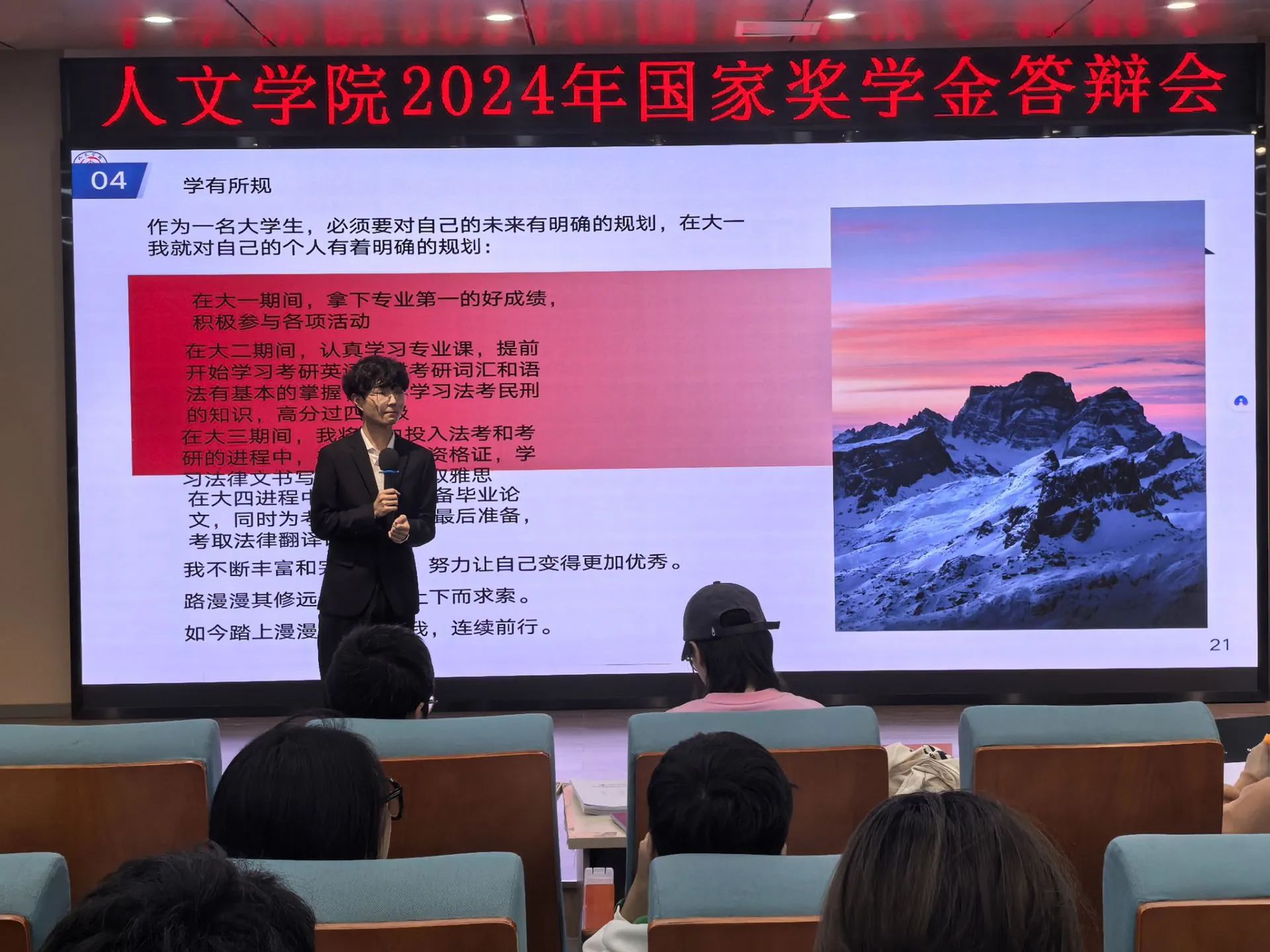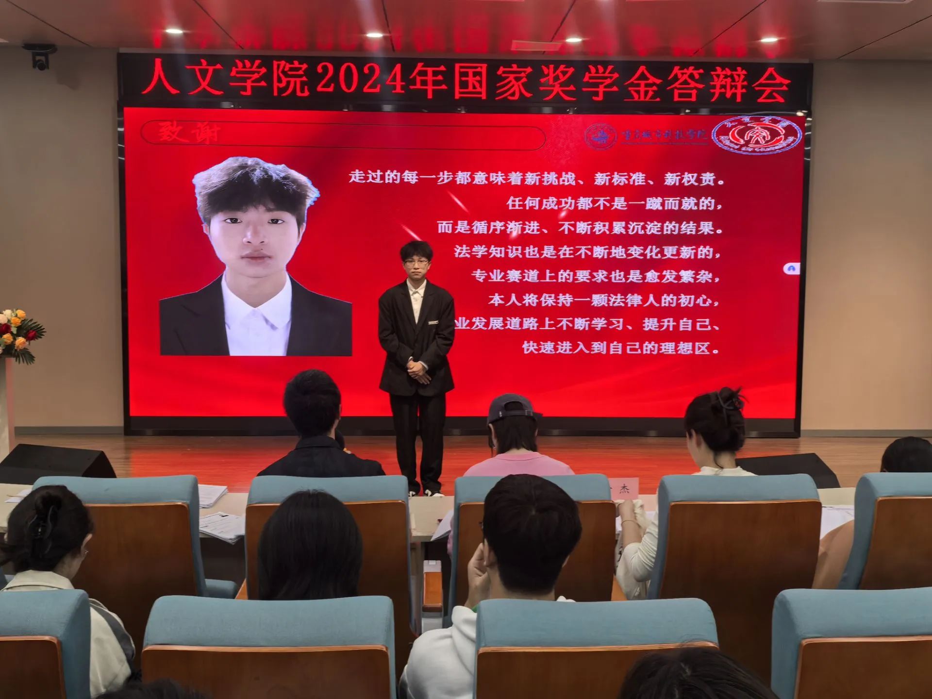 2024 年 10 月 17 日 15:00,人文学院2023-2024学年国家奖学金评选答辩会在第二学术报告厅顺利举行。此次活动不仅是对过去一年里勤奋学习、全面发展的同学们的肯定,更是激励同学们追求卓越、勇于担当的一次精神洗礼。