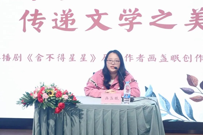 画盏眠女士以其独特的视角和深刻的见解,给现场同学带来一场生活与文艺作品创作如何完美契合的精彩分享,她指出自己的创作初衷来自于对生活的感受,首先要热爱生活、享受生活,才能创作出喜闻乐见的文学作品;其次,要做到想表达、敢表达,不要害怕自己的想法不够成熟或不够完善,只有勇敢地迈出第一步,才能逐渐找到属于自己的声音。她认为写作的基本方法是表达与阅读,需要将自己的想法转化为文字,同时做好逻辑构思,做到思维的可控性,使表达更加有力、更加清晰。