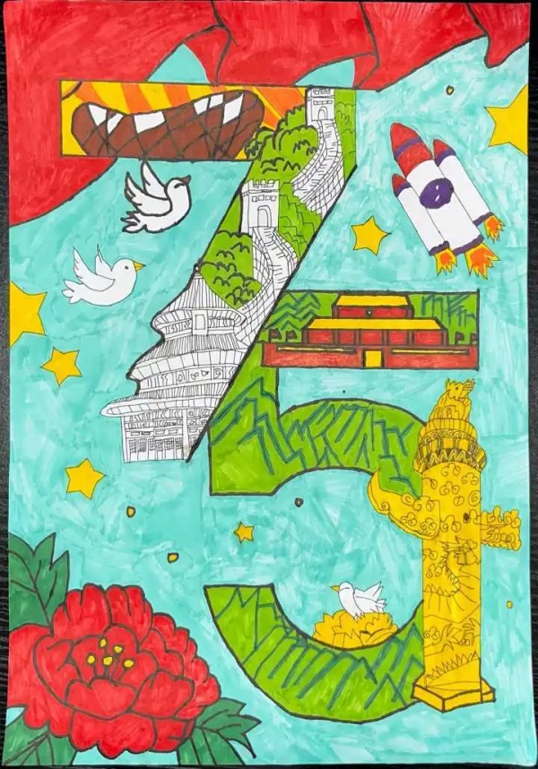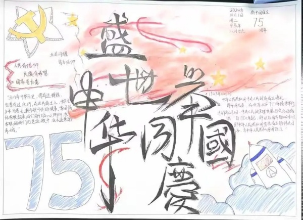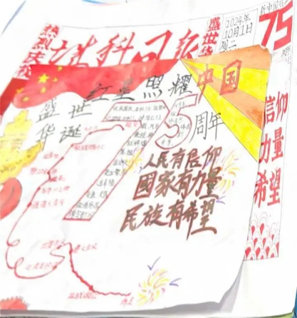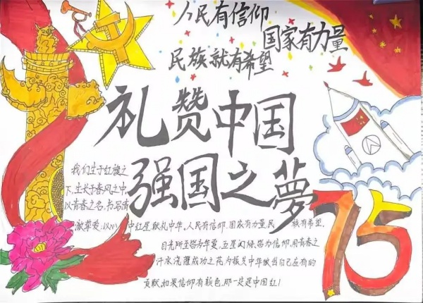 青春礼赞七十五,同心共绘华章路。每张手抄报,浓缩百年,汇成波澜,聚焦于新中国成立以来的不同伟大成就,从科技的飞跃发展到人民生活水平的显著提高,以翔实的资料和生动的画面进行呈现,用青春和热血礼赞新时代,表达出青年秉承先辈、复兴祖国的宏图志愿。作为新时代青年,应铭记“艰难困苦,玉汝于成”的奋斗历程,秉承“实事求是,与时俱进”的科学态度,弘扬“勇于革新,敢于胜利”的革命传统,与祖国携手共进,在盛世中继续同心共筑,谱写更加华丽的篇章!