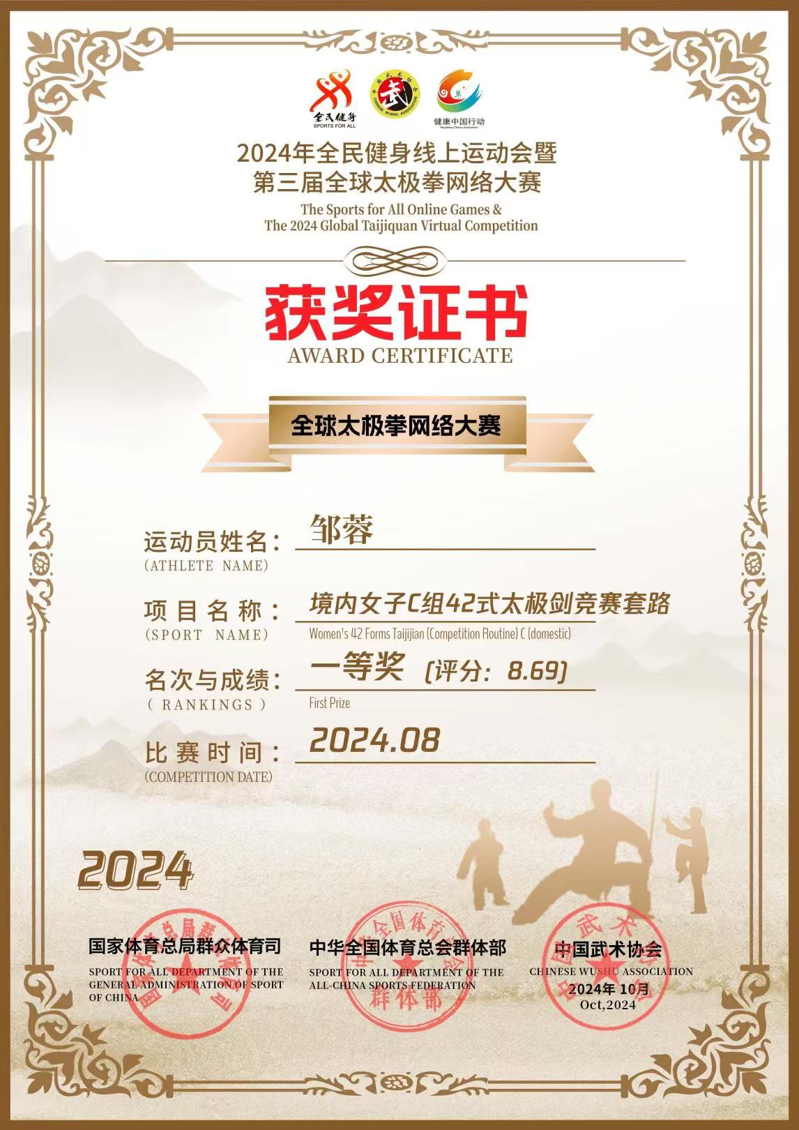 近日,由国家体育总局群体司、中华全国体育总会群体部、国家体育总局武术运动管理中心、中国武术协会主办的2024第三届全球太极拳网络大赛圆满落下帷幕。学校体育与大健康学院教师邹蓉一举夺得“女子42式太极拳一等奖”、“女子42式太极剑一等奖”,为学校增光添彩。此次比赛不仅展现了其精湛的技艺和深厚的太极文化底蕴,同时也展示了中国传统武术的魅力与活力。
