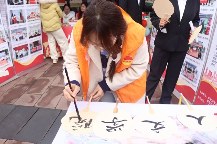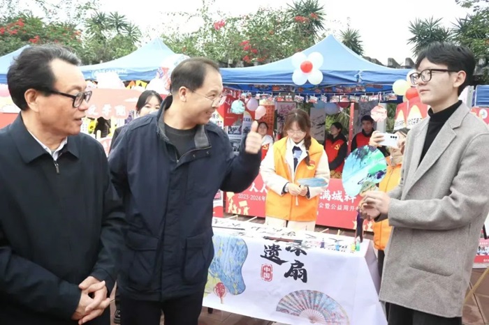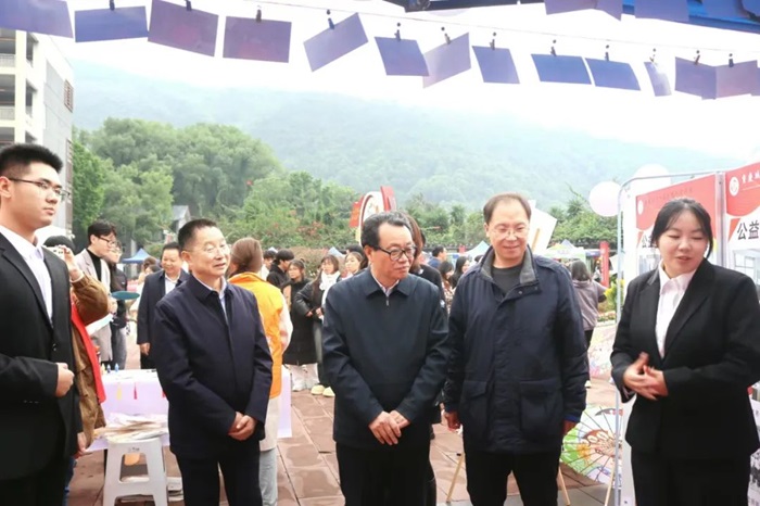 活动伊始,我院有幸迎来了重庆市慈善联合总会副会长况由志、永川区慈善总会党支部书记、执行会长唐元华、重庆城市科技学院党委副书记、副校长贾瑞等领导莅临参观我院公益周主题展。工作人员向领导们讲解学院公益活动的工作亮点与特色,展现学院的美好现象和良好的精神风貌,并展示了漆扇的制作,宣扬优秀传统文化。领导对活动的组织策划、现场布置及参与人员的精神风貌给予了高度评价,并指出本次活动不仅是为响应党中央号召,进一步践行社会主义核心价值观,更要在全社会广泛弘扬奉献、友爱、互助、进步的志愿精神,更好发挥志愿服务的积极作用,促进社会文明进步。