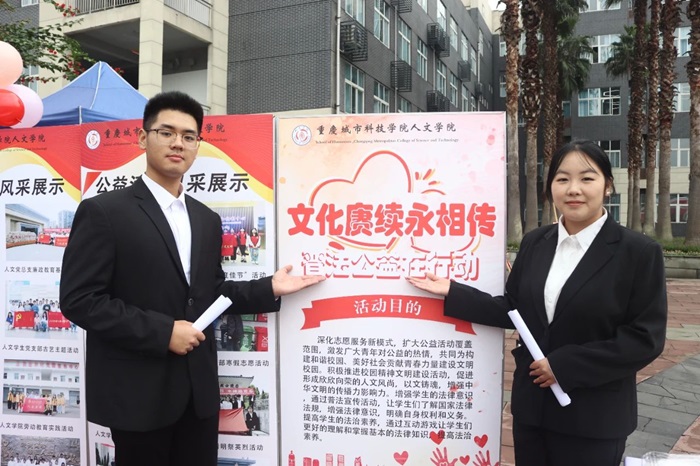 为进一步弘扬奉献、友爱、互助、进步的志愿精神,深化志愿服务新模式,扩大公益活动覆盖范围,激发人文学子对公益的热情,并增强人文学子的法律意识。11月21日至22日,人文学院于第一教学楼前广场正式开展“文脉赓续永相传,普法公益在行动”公益周活动,此次活动由共青团重庆城市科技学院人文学院总支部主办,人文学院学生委员会,人文学院党建工作站,人文学院各学生党支部协办。