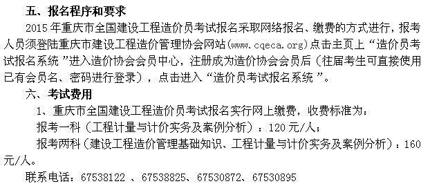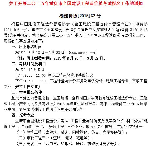 注:详细报名通知见关于开展二○一五年重庆市全国建设工程造价员考试报名工作的通知