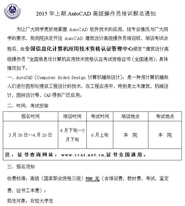 2015年上期AutoCAD高级操作员培训报名通知