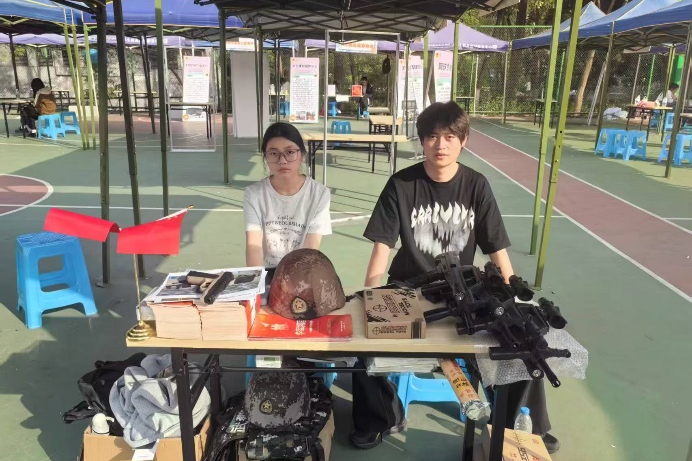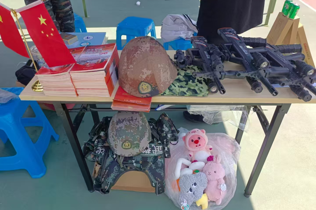 走进服务站展区,仿佛置身于军旅世界。几套不同款式的迷彩服整齐陈列,笔挺的剪裁、鲜明的肩章,无声诉说着退役士兵的荣耀与使命。一旁,仿真枪支模型在展示台上摆放有序。这些仿真枪支模型均严格按照国家相关法律法规制作,用于科普教育,旨在让同学们在工作人员的详细讲解下,了解枪支的构造与军事知识,激发同学们对国防建设的兴趣与热爱。同学们围聚四周,好奇地观察枪支构造,不时提出问题。从枪支的性能到用途,同学们对军事装备有了更深入的认识,现场气氛热烈而专注。