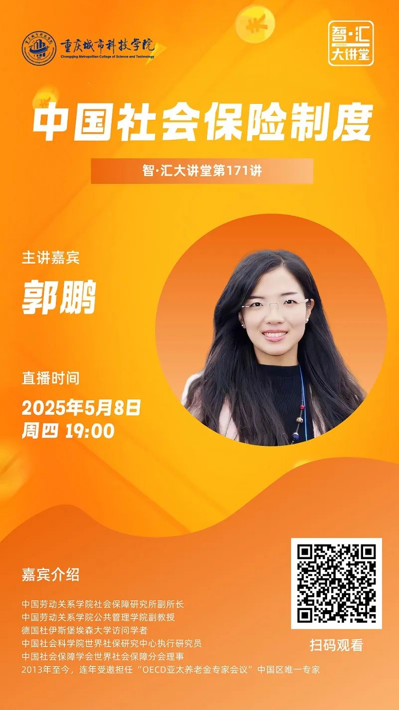 1主题讲座 中国社会保险制度 02主讲教授 郭鹏 中国劳动关系学院社会保障研究所副所长 中国劳动关系学院公共管理学院副教授 德国杜伊斯堡埃森大学访问学者 中国社会科学院世界社保研究中心执行研究员 中国社会保障学会世界社会保障分会理事 2013年至今,连年受邀担任“OECD亚太养老金专家会议”中国区唯一专家 03讲座详情 时间:5月8日 周四 19:00 观看方式:一键扫码观看直播(可回放)