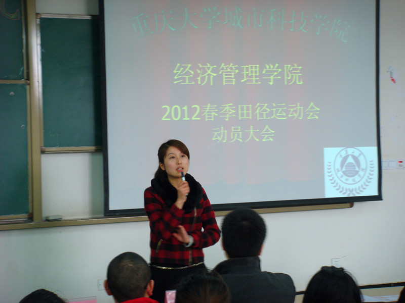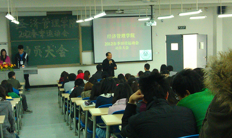 在我校春季运动会即将来临之际,为了提高同学们对运动会的关注和参与热情,2012年3月16日中午,经济管理学院2012春季运动会动员大会在我校新教202隆重举行。