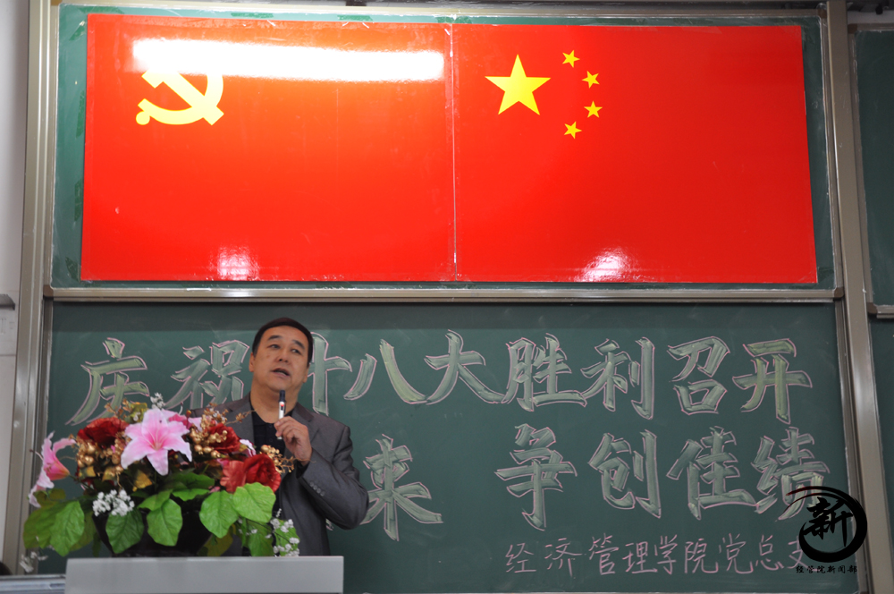 最后,经管学院党总支赵昌龙书记对本次大会进行了总结。并号召全体党员,在今后的工作学习当中,切实践行十八大会议精神,充分发挥先锋模范作用,为学院的发展贡献自己的一份力量。